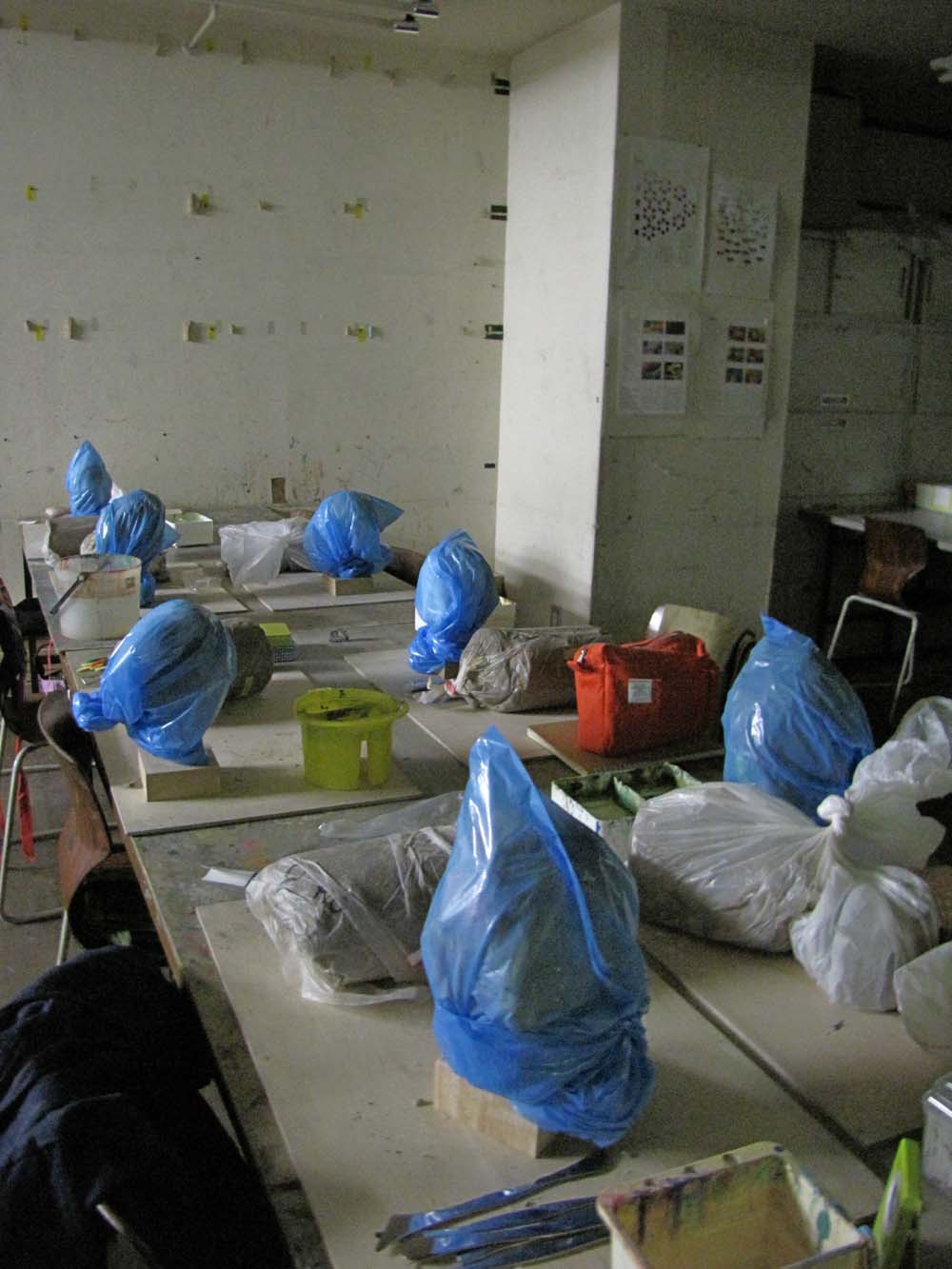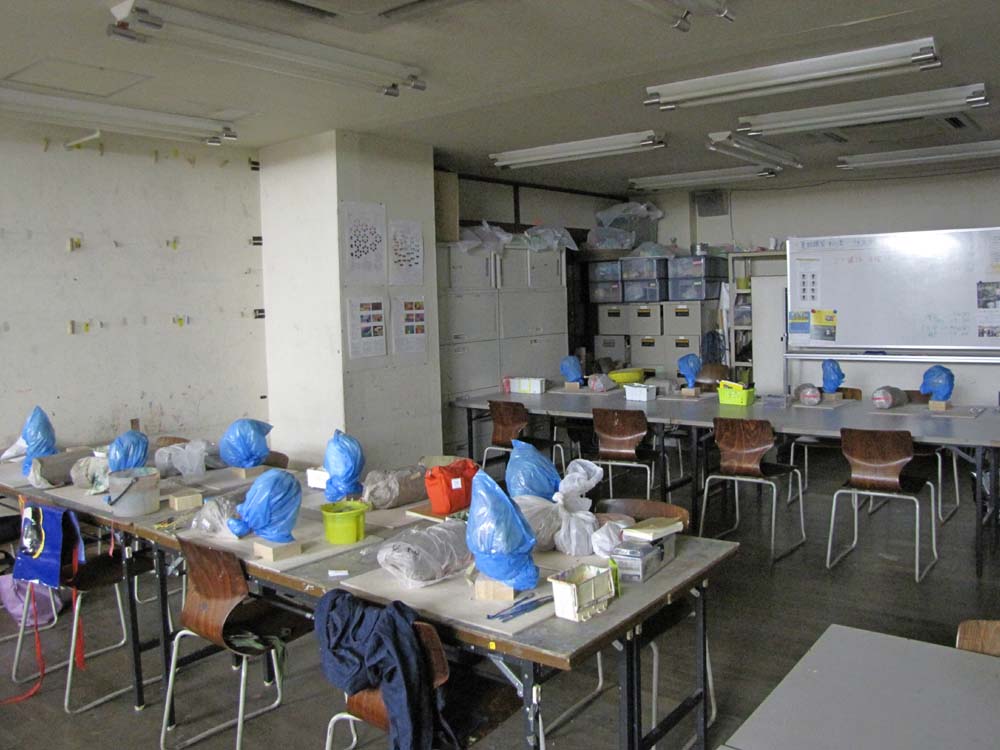 10 June NET指定スクーリング日 授業後の北山校大教室です。ほの暗い教室に浮かび上がる怪しげな青い包み。実はこれ人間の首なんです。床の片隅には不気味な水染みの跡。誰もいないはずの玄関から不穏なノイズ。首は今日から北山で始まった塑造授業の粘土首像です。水染みは掃除をしてて水をこぼしました。ノイズは金魚のブクブクです。というわけで、塑造演習。始まっています。塑造だけれども僕はこの課題、鉛筆デッサン強化の演習だと思っています。普段二次元でやっていることを、実際に三次元の中で把握する。裏側も造る。触れる部分は全部造る。そんな体験です。説得力のあるデッサン作品というのは視覚頼りではなく、必ずそうして頭の中で物を触りながら描かれます。塑造も、もちろん視覚で確認しながら造りますが、捏ねて撫でて削って盛って、自らの手をドロドロにしてじかに触覚で三次元的な描写をするわけです。この演習が終わった後、みんなの鉛筆デッサンが少しでも変わったらいいなと思います。さて、NET生は指定スクーリングの日が迫ってきました。確認しておきましょう。日時:6/15(土) or 16(日) 各校にて■土曜日は授業前、日曜日は授業後に、それぞれ6月提出作品の講評会が行われます。指定スクーリング時間は、以下となります。 6/15(土) 提出作品講評会 13:00~13:45 課題制作 14:00~20:30(休憩時間 17:00~17:30) 6/16(日) 課題制作 09:30~17:00(休憩時間 13:00~14:00) 提出作品講評会 17:15~18:15同じ目的を持ったたくさんの人たちと一緒に制作するすごく良い機会ですね。課題を確認して気を練っていてください。NET生にとって、いや通学生にとっても刺激になる良い日でありますように。はやし [0回] 2013/06/10 (Mon) 21:54 アスクでのこと Comment(0)