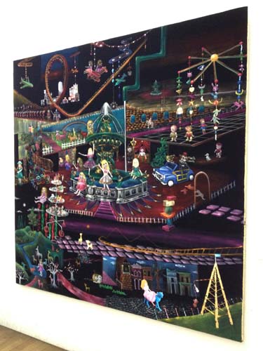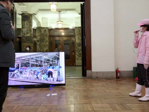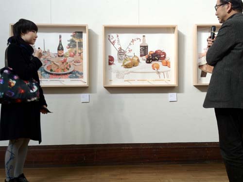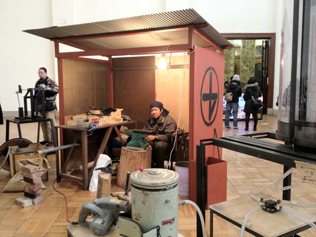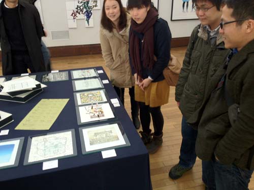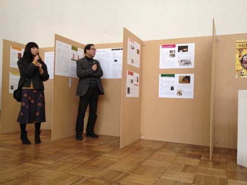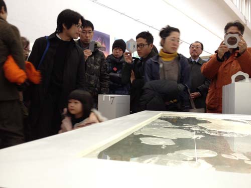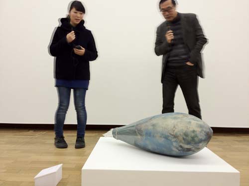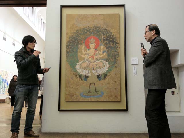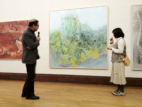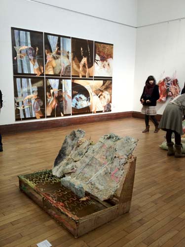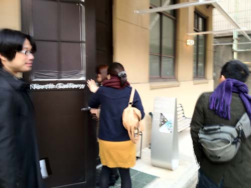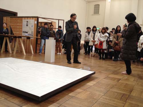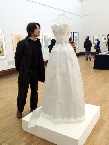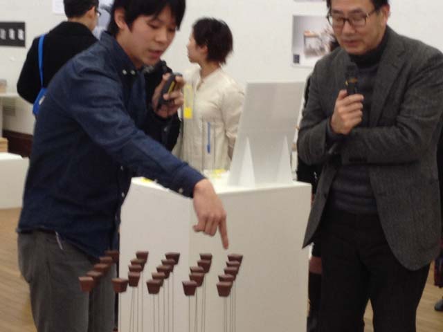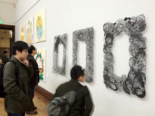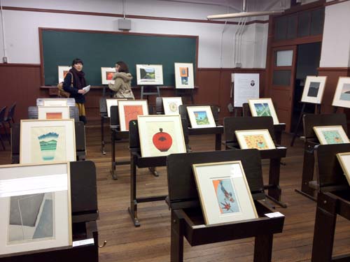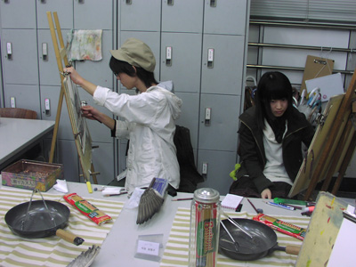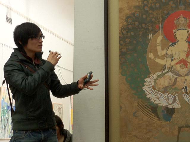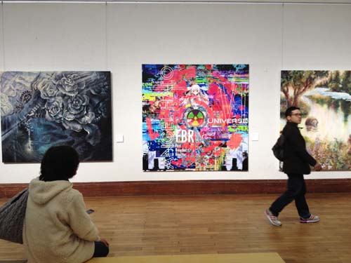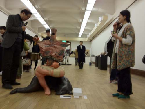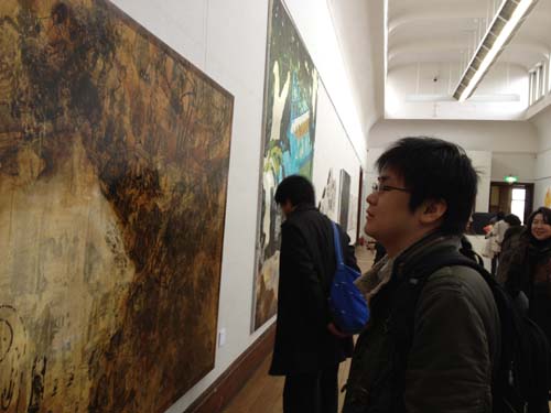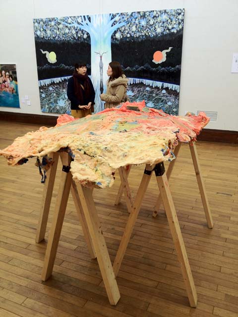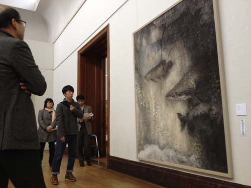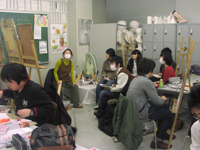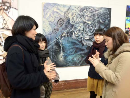 05 March アスク美術倶楽部で京芸制作展観にいった!! こんばんは。少し前の話になりますが、2月17日(日)美術倶楽部で京芸制作展に行きました。やや長いですが、興味のある方は読んで下さい。ない方は写真のみ飛ばし観して下さい。今回は、参加者5人のみでした。新年~年度末までのこの時期、多くのメンバーは仕事が極度に忙しいようで、通常授業の参加も少ない傾向があるのですが、ややさびしかったです。(一方で、昨年、名古屋に引っ越された部員が、新幹線で来てくれたというサプライズもありました)実は美術倶楽部員にはプロの方も多く(デザイナー、ゲーム関係など)、そういった方からすれば「学生の作品なんか」ということもあったかもしれませんが、いやいや、けっこう面白かったです。客観的評価はなかなか難しいのですが、保田の感想では、(ここ数年の)京芸の作品展のレベルは(保田が在籍していた)約20年前より、かなり上っていると思う。京芸が他の美大に対して、相対的に上ったという訳でもないと思うのですが、たぶん、世の中の水準が変ったせいではないか、と思っています。つまり、日本がより「先進国」となり文化的な洗練の度を高めた、ということではないか、それが、京芸の制作展にも影響しているのではないか、と思っています。僕らのころは、もっと泥臭くて、洗練されてなくて、少しどんくさい感じがあったと思います。ただ、泥臭い方がいいのだ、など、別の意見もあるのでしょうけど…。前置き長すぎましたね。美術倶楽部部員には、油彩を描いていたり、今後描こうという人が多いので、油彩の部屋をまずは見て回りました。保田の出身コースでもある訳です。また、アスクの受験コースのOBが非常に多いコースでもありますね。とか、言いながら展示室に入るなり、OBのTさん作品があった。Tさんらしいゴージャス感のある作品ですね。ちなみに、美術倶楽部でもよく使っている北山校の小教室には彼女の着彩作品がいまだに展示されています。部員の作品はやはり具象作品が基本なのですが、京芸の油画ではリアリズムに徹したような作品はほとんどないので、直参考になる作品は少なかったのですが、それでも、部分的には写実表現の入った作品もいろいろあった訳ですが、離れて見るとしっかり見える画面が、近づくと案外あっさり塗られてたり、えらいラフなタッチだったり、また、油彩の表現といってもいろいろであることなど、わかったのではないでしょうか。美術倶楽部では、一応、基本をサラッとわかってもらった上で(実際は、そこまでにかなり時間かかるのだが…)、その後、自由な制作ができるようになればいいな、と感じております。背景の絵に溶け込む2人の部員。うしろの魂のようなものが気になる。左写真の中央作品:東京のオタク系の世界ですごく売れているという噂のI君作品。しかし、美術倶楽部でも、終了時の掃除の時お世話になっている非常勤の高木先生の作品がないなあ、と思ったら、学内展の方だったようです。しかも市長賞受賞してた。やっぱりな、という感じ。アスク非常勤の森先生とばったり会う。森先生は日本画の3回生なのですが、大学での制作とは別に絵本をつくってMOE絵本グランプリ家作賞をもらったところなのですが、最近、絵本の制作を始めた美術部員にお勧め公募展の情報を提供してくれた。友達の輪、というか、制作の輪が広がるのはいいことです。さて、次は、いよいよ今回のメインのギャラリートーク。市長賞の受賞者が京芸現学長の建畠晢先生にインタビューを受ける形で自作を語るという形式でした。ワールドワイドに活躍されるキュレーターかつ、批評家、さらに詩人でもある建畠先生に作品を見てもらうというだけですごく緊張する場面なのですが、今回は表彰された人に「おめでとう」と祝福するのが基調の企画なのだから、鋭い突っ込みなどは封印されておりました。その意味では、やや面白みに欠けるものではありましたが、話の苦手な芸大生も多い中、一般の方に作品のポイントが理解されやすいよう、うまく話を引き出されておりました。観客もけっこう多かったです。自分もそのタイプなのでわかりますが、特にアート系の生徒は、自作を語れと言われても、今ひとつ要領を得ないような曖昧な会話に終始しがちなのですが、そんな中、えらいしゃべりのしっかりした奴が一人だけいました。それが、アスクOBの池上君でした。(大学HPに実名が出ているので、実名表記とさせてもらいます)池上君は、神戸からわざわざ京都北山まで毎日通ってくれた生徒なのですが(今では、七条でも浪人できるので、神戸からでもぜんぜん近いです!)、当時からデッサン力はすごかったですね。(しかし保田が指導を担当していた色彩はすごく苦手で、苦労してた。どうしても色味が薄くなるという弱点があった)「模写の技術を極めた後、自分のオリジナル作品が描きたくならないのか?」「いいえ、自分としては、元作