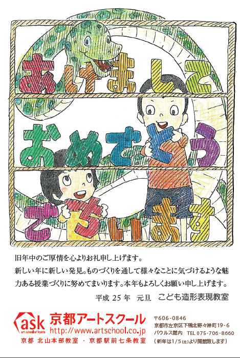 01 January 謹賀新年 明けましておめでとうございます。 お正月いかがお過ごしでしょうか。 下宿している浪人生は、久しぶりに実家で家族と顔を合わせられているかな。 わたくしサイトウも、地元に帰省しています。 今年は一人で過ごしてますって人もいるのかな? 勉強もしたくないし、かといって外にも行きたくないし……って 人は小説とか読んでもいいかもしれないですね。 こたつで寝て風邪引いてってことにならないように気をつけてね。 先日の京芸模試講評会の様子です。 それでは、本年もよろしくお願いいたします! 国公立・私立一般受験組は…、センター試験。 ちょっと息抜きしたら、また机にむかいはじめてね…。 今年の年賀状はTさんの作品を使用させていただきました! ほかにもいい作品があったのですが、 華やかさを考えたときにTさんのものに決定。 ちなみに、こども教室の年賀状はこちら。 <サイトウ> [0回] 2013/01/01 (Tue) 22:02 アスクでのこと Comment(0)