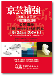 11 September 京芸補強 始まります! こんばんわ。北山教室のマシヤマです。後期の授業が始まって1週間経ちました。STSP生は昨日から後期スタートなので、一週間の休みがありましたね。どうですか?リフレッシュできたでしょうか?人目(アスクの先生の目?)をはばかることなく息抜きができるチャンスなので、大いに休んでほしいと願う……そんな1週間でした。さて、本日は秋の特講の一つ、【京芸補強】のご案内です。毎年、この時期におこなう特講の中でも、ピンポイントで対策ができるのが特徴。最短で2日間からの受講が可能なので、とても手軽に受けることができます。<描写> <色彩> <立体>基礎的なことについて「今さら誰にもきけない!」という人には京芸補強が特にオススメです。「いつどんな課題をおこなうのか?」など、詳しくはこちらからチェックしてください。⇒■■■調べてみたら、「今さら誰にもきけない!」というタイトルの本が世の中に多い!こんな感じに……→■■■大人になると素直に聞けないことが多くなるのかもしれません。<マシヤマ> [0回] 2012/09/11 (Tue) 20:46 アスクでのこと Comment(0)