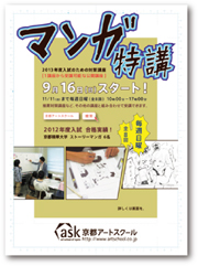 12 September 後期 『マンガ特講』、始まります! こんにちは。実技講師の上杉です。今週9月16日(日)~スタートするマンガ特講(後期)に関してのお知らせです。11月11日(日)まで、毎週日曜日に全8回で行われます。詳しくはこちらから■■■マンガ特講(前期)の様子。↓七条教室の約半分の席を埋める受講者数で、非常に活気がありました。 マンガ特講の授業を通じて、この半年の中で僕が強く感じた事。作品とは、自分以外の全ての人に向けた「プレゼント」だという事です。自分の作品を観る(読む)前と後で、鑑賞者(読者)がほんのちょっぴりでも、世界の見方が広がる、しいては幸せになる事が出来る為の、プレゼントであるべきだと思います。プレゼントの中身は、自分がこの作品を通して、「伝えたい事」。自分がこの作品を通して、「一体皆に何を伝えたいのか」。この事について、制作者側が恐ろしく無自覚で、制作しているシーンを数多く見てきました。「伝えたい事の塊」は、地中にある化石のように、姿は見えません。丁寧に繊細に掘り起こす必要があります。慎重な作業になります。ずさんに掘り起こそうとすると、すぐに崩壊し、指の隙間からこぼれ落ちていきます。その作業は、制作序盤に行うべき、作品の「命」になる部分だと思います。ストーリー・キャラクター・構成・セリフなど、マンガ表現の全ての要素は、「伝えたい事」を核として、決められていくのだと思います。「この作品を通して、自分は一体、何を伝えようとしているのか」この事を掴みとる事が、作品制作に於いて、何よりも大切であると、強く感じます。今週から始まるマンガ特講で、皆の作品を拝見する事を楽しみにしています。上杉 [0回] 2012/09/12 (Wed) 16:42 アスクでのこと Comment(2)