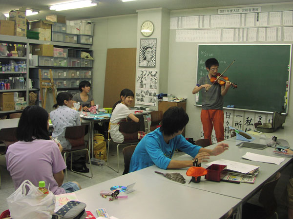 06 September 秋の特別講座 この写真は、夏期講習最終週のお昼休みのひと時です。七条教室のFくんがモチーフのバイオリンを取り出し、演奏会を開いてくれました。このFくんの演奏がすごいのすごくないのって、もうすごい。即興で何でも弾けてしまうんですね。「情熱大陸!」「ミスチル!」「ポケモン!」「笑っていいとも!」「ビバルディの四季!」「マリオブラザーズ!」「エヴァ!」……皆口々に勝手なリクエストをぶつけますが、全部弾いてくれました。それもすごい完成度で。頭の中にメロディがありさえすれば、何でも演奏できるそうで、卓越した技術というのは、それだけでこんなに人を楽しませてくれるんだということを目の当たりにしました。技術があればこその表現力なのですよ。最後は「カントリーロード」。しかも七条ST生Yさんの歌(これがまた上手い)とのコラボレーションです。Yさんの澄んだ歌声と、バイオリンの音色が少し物悲しく響いて、教室は夏の終わりのおセンチ気分で満たされました。さて、そんなおセンチな気分とともに秋がやってまいります。たまのおセンチもいいけれど、そこはこちとら受験生。秋の特別講座がもうすぐ開講です。詳しくはコチラしっかりと技術をたくわえて、冬に備えましょう。はやし [0回] 2012/09/06 (Thu) 19:17 アスクでのこと Comment(0)
