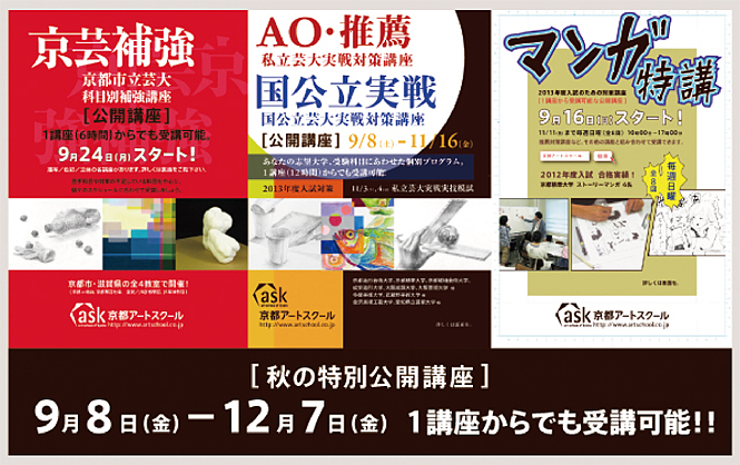 08 September 楽しさの種類 こんばんは。サカグチです。 本日、9/8(土)から「AO・推薦 私立芸大、国公立芸大 実戦対策講座」がスタートしています。 AO、推薦、国公立芸大の実戦課題をそれぞれの志望校に沿って受講できる実戦対策の講座です。 後期には他に「京芸補強」(9/24(月)~)と「マンガ特講」(9/16(日)~)があり、それぞれの状況にあわせて受講できるようになっています。(※ホームページに詳細をのせているので、チェックしてね) 勉強の秋、制作の秋、学科の秋、実技の秋、どちらにせよ楽しい秋がはじまります。 さて、「楽しいこと」と「ストレスを感じること」って対極にあるように考えていたけれど、もしかしたら表と裏の関係なんじゃないかと最近思っています。 ストレス解消にカラオケへ行こうというのもひとつの楽しさだけど、難しいことに向き合わなければ感じることのできない「別の楽しさ」もあります。 何が難しいのかといえば、自分の思い通りにいかないときこそ難しい。自分の思いを捨ててしまったり、無理矢理押し通してしまったりすれば、ストレスもやわらぐけれど、きっと楽しくもなくなる。 最初にあげた「カラオケの楽しさ」は、決して遊びの中だけで得られるものではなく、制作や勉強や仕事など「カラオケとは別の楽しさ」があるような場面にも潜んでいるから厄介です。 一生懸命勉強して楽しく感じたら、それはカラオケとは違う楽しさかというとそうではなく、結局カラオケと同じ楽しさだったりします。 やるべきことを決めて必死になる。折れそうになったけどやりとげる。充実感も得た。 だけどそこで感じている楽しさはまだ、カラオケの楽しさと同じだ。 「カラオケの楽しさ」と「別の楽しさ」が対極に位置しているのだと考えてみます。 どちらも楽しいけれど全然違う。得がたいのは「別の楽しさ」だ。カラオケの楽しさなんか必要ないといっているわけではありません。 AかBかどちらが正しいのかではなく、状況に応じてAなのかBなのかを判断することが重要です。 もちろん、AとBが両方必要なときだってある。 ここでいう「別の楽しさ」とはいったい何なのか。 そのバロメーターは他者にあります。チームメートであったり、家族や友人、生徒、自分以外の誰かにあります。自分の行動が誰かを助けたり、誰かを動かしたり、誰かを変えたりすることができたなら、そこで感じる楽しさはもう「カラオケの楽しさ」ではなくなる。 極端な話、カラオケでうたう歌で誰かの気持ちを変え、行動を起こさせることができたのであれば、そのカラオケの楽しさはもう「カラオケの楽しさとは別の楽しさ」となります。 今、楽しいけど、これって誰かの役に立つのかな。 今、充実感を感じているけど、これって誰かを助けるのかなと考えてみる。 できれば少しでも誰かの役に立ちたい。そこには得がたい楽しさがひそんでいるから。 サカグチ [0回] 2012/09/08 (Sat) 07:06 アスクでのこと Comment(0)