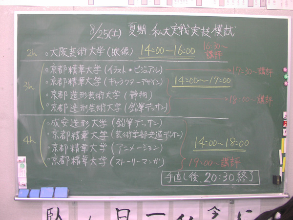 28 August 8月25日(土)私立芸大実践実技模試 報告 こんにちは。七条教室より、実技講師の上杉です。本日は先週土曜日に七条教室・彦根教室にて行われた、私立芸大実戦実技模試の様子をご報告します。 七条・彦根両教室で模試受験者は合計24名。様々な学科・コースの試験課題が行われました。試験結果には大いに悔しがって欲しいと思っています。後期以降、私大受験者は秋のAO入試・公募推薦入試と、間髪いれず次の試験が待ち受けています。第1志望合格に向けて、とても重要な試験です。残り1~2ヶ月。1~2ヶ月間はとても短いです。試験日は、あっという間におとづれます。試験までの日数はこれ以上増やせないなら、日々の密度を上げるしかない。生徒の取り組みだけではなく、講師側の指導や講評に、どれだけ内容の濃い事が言えるか。勝負の期間に入ります。お互い頑張ろう。上杉 [0回] 2012/08/28 (Tue) 14:53 アスクでのこと Comment(0)