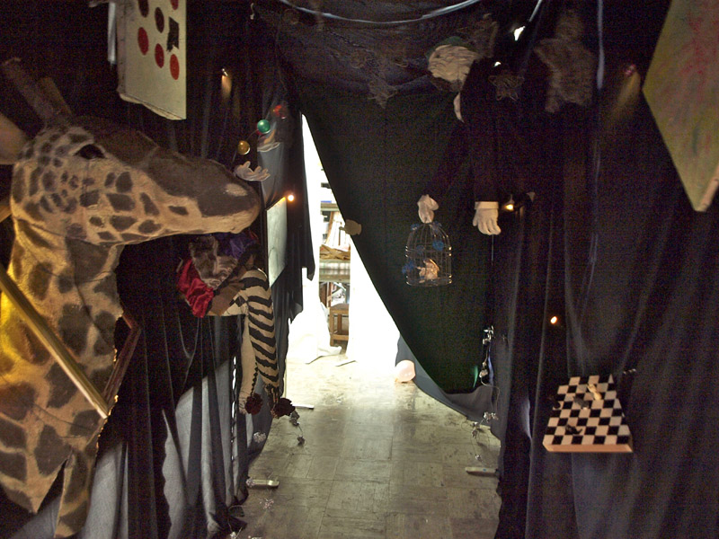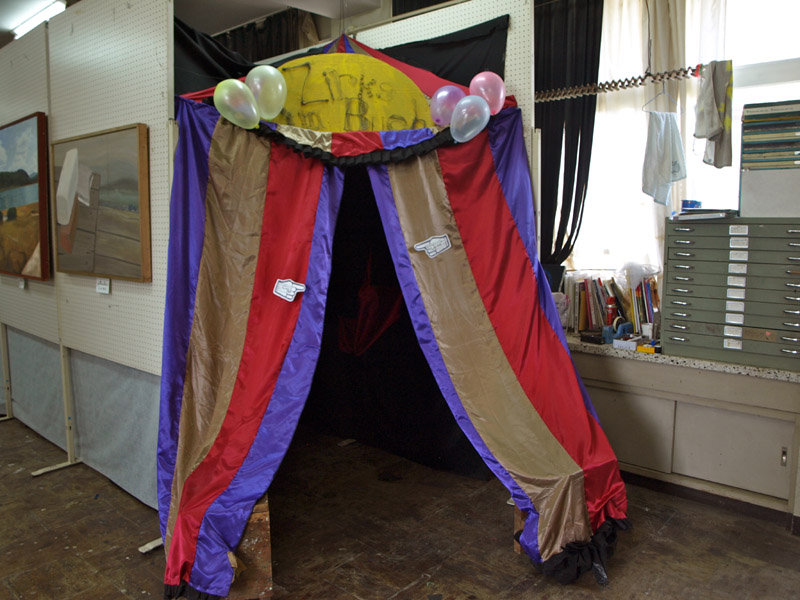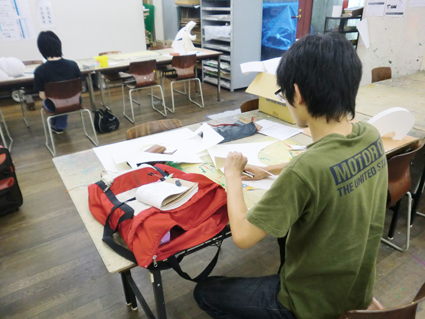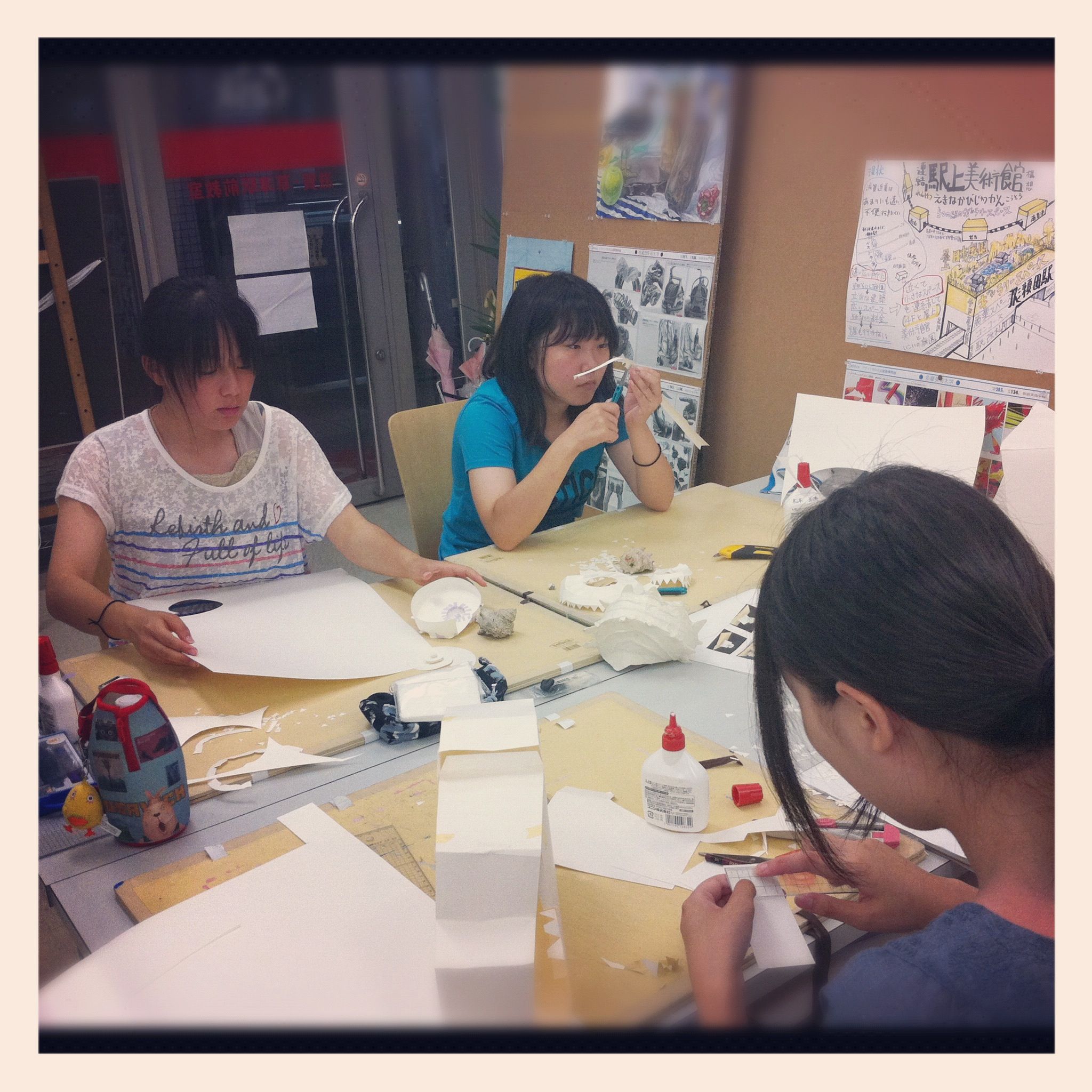 17 July 東大津高校 文化祭 草津教室です。日程調整で夜間に3人の生徒が制作しています。京芸志望のHさんは朝一番からの出席でした。本日2課題を仕上げるというハードスケジュールで後半は見るからにへろへろです。←へろへろのHさん「レンガを支える立体」を制作中、「今のこんなあたしにレンガなんてこれっぽっちも支えられない」とブツブツこぼしていたとかいないとか。あとのふたりは基礎生のTさんと、私大志望のGくん。さて、くしくも3人は同じく東大津高校にて学び舎を共にしてらっしゃいます。休憩時間に基礎生のTさんが、先日、東大津高校で開催された文化祭の様子を写真で見せてくれました。Tさんの所属する美術部の展示風景を見せてくれたのですが、これが面白い。普通に油絵なんかを展示するスペースの裏に、なんとも怪しいインスタレーションがしてありました。 漢字にすれば、「陰棲侘霊刺四」と書いてもいいぐらいに奇怪なインスタレーションです。キリンが額縁から突き出ていたり、鳥人がぬぼっと立っていたり、前衛極まりない絵画が埋め込まれていたり、ゼブラ柄の女の足が艶かしく鎮座していたり、チェス盤が空間に溶け込んでいたり……。シュールレアリズムですなあ。布一枚縫うところから全部手作りで、大変好評だったようです。非常に充実した文化祭だったようでなによりですね。遅くまで女子と残ってぎこちなくそわそわと文化祭の準備をしたあの頃を、すなわち高校生活の醍醐味というやつを、甘酸っぱく思い出しています。はやし [0回] 2012/07/17 (Tue) 22:17 アスクでのこと Comment(0)