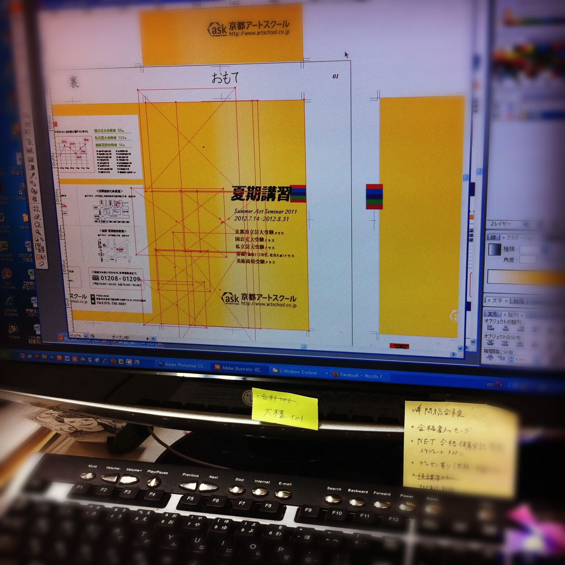 10 May デザイン作業… またまたサイトウです。 最近、出現率高いですね… 今、夏期講習パンフレットをデザイン中です。 こういったデザインワークが、わたしの主な「制作時間」になります。 作業してて本当に毎回毎回苦しい……笑 それが成長しようとしている実感、生きている実感でもあると思うけど…。 しんどい…笑 講師・スタッフ紹介の中でも書いてるのですが、 「美しいものを選ぶことは簡単ですが、自分で創り出すことはとても難しい。」 と実感します。 美しくないことは分かるけど、どうやったら美しくなるか分からない 実技対策や学科勉強してるみんなもそんな苦しさを抱えていると思います。 でも苦しいこと避けなかったら、本当に成長していくと思います。 妥協しそうになったそのときに「ここでやめない。もういっちょだけやる」と踏ん張る。 問題点を自分なりに探して、解決案を試す。 分からないときは、とにかく作ってみる。 それを繰り返す。(正直、「もう知るかー」って妥協することもあるけど。笑) わたしのまわりの尊敬できる人って、みんなそれをやってる。 これは、私が3年前はじめてアスクの印刷物を作成させてもらったもの。 ポスターですね。 制作させていただいてこういっちゃなんですが、 文字の間、インパクト、装飾…我ながらひどいと思います… 1年後のチラシ。(至らないところもあるけど、これはけっこう気に入っている) 実際、「やらなきゃいけないこと」があると、 そのプレッシャーでネタ探しをするようになります。 で、ちょっとしたアイデアが引き出しにたまっていくんですね。 「今度なんかのチラシつくるとき、あの書体使ってみよ」 「透かし入れたらきれいかも」 「ペールトーンばっか使ってみたら、品がいいかな」 とか。 しんどいのは当たり前。自分に「圧」をかけること。 逃げなかった後、自分がちょっと好きになれます。 自分のことが好きっていうのは難しい。わたしの長らくのテーマです。 私は「芸術=自由」って認識が強くて、 努力をすっとばした「才能」みたいなものに、憧れてたなぁって思います。 学生時代は「自由」を都合良く解釈してた。 「しがらみにとらわれない生き方」とか… 結局 「自由=楽」でしかなかったなぁと思います。 そうこうしてると努力をすっとばさなかった人が先を歩いて行きます… 重々、気をつけて。 とりあえず、楽じゃない方を選んで行きたいなぁと思う今日この頃です。 しんどいとか、苦しいとか書いてるけど、 結局制作したものが形になったとき、やっぱり「嬉しい」。 みんなもそういう「嬉しさ」を実感してほしいなぁと思います。 苦しいことあるけど、がんばってくださいー◎ <サイトウ> [0回] 2012/05/10 (Thu) 00:56 アスクでのこと Comment(0)