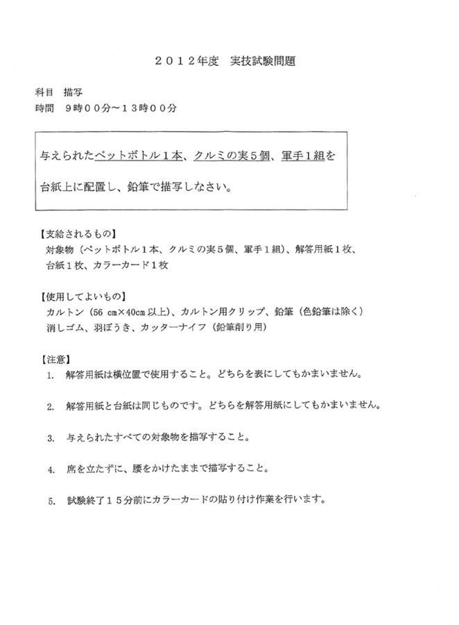06 March 京芸ファイル 速報! お疲れ様です。 今晩は、現在公開中の京芸ファイル(入試速報)について紹介します。 今回の京芸ファイル(入試速報)は、毎月アップされる京芸ファイルの 中でもダントツで注目度が高いものです。 京芸の入試問題、モチーフを、ほぼ完全な形で最も早く紹介しているのが この京芸ファイルだからです。 ちなみに 問題文は生徒が持ち帰ったものを、提供してもらいスキャンしたものです。 モチーフは、生徒からの聞き取り調査をもとに、コーナン、ダイソー、その他 お店を探しまわり、またNETで検索しまくってかき集めたものを、再度、 生徒に確認して確かめています。 ※春期講習では、入試問題を制作するので、そのためのモチーフ準備も兼ねています。 その際、アスク生の中でも、最もデッサン力の確かな浪人生 (最近は多浪生がいないので1浪生ですが)などを中心に 聞き取り調査をするのですが、時々、意見が割れてしまうこともあり 「君達のデッサン力は大丈夫なのか?」 と言わかくてはならないこともまれにあります。(ほとんどないです) 内容については、本文を読んでほしいのですが… 今回の入試は、描写・着彩と色彩・立体で、性格が大きく異なる内容でした。 描写・着彩は、普通でした。特に問題なし。問題含みなのはやはり、色彩・立体でしょうね。 両方とも何十年ぶりという出題です。 来年度から入試が2日間になり、色彩が1課題となる(戻る)ということが発表された訳ですが そのことと、今回の色彩・立体の出題を重ねて考えた時、今後の京芸入試の方向性が 見えてくるように思われます。 が、その点は、まだアスク的にも分析中なので、ここでは書きません。 今回はあくまでも、問題文とモチーフ、材料の紹介にプラスして、現時点で書ける ごく常識的な範囲の解説を入れるにとどめています。 しかし、はたして評価はどう出るのか? その点に関しては、9日(金)の合否発表ではまだわかりません。 得点の内訳が確認できるのは4月以降です。 4月の京芸ファイルまで待ってもらう必要があります。 ご期待下さい。 あ、その前に、再現作品がまとまって見られる機会があります。 ⇒芸大受験説明会。必見です。 保田(草津教室より) [0回]PR 2012/03/06 (Tue) 21:41 アスクでのこと Comment(0)