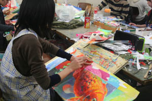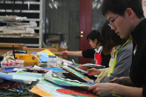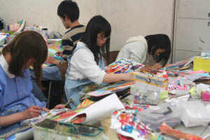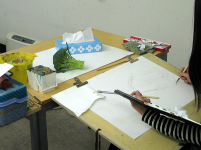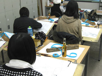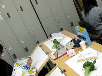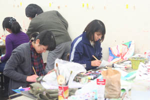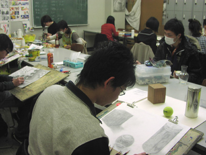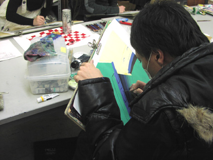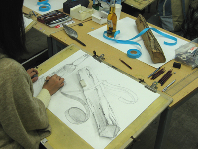 26 January 北山教室の様子 北山教室の様子です。直前講習も二週目に突入し、教室のボルテージも高まってきています。大教室も学科教室もきっちきちです。 本日の課題は色彩です。なので道具がかさばり、机の上もこのありさま。前半は「自然界の調べ」後半は「人間界の夢」というテーマで制作しました。色彩構成、とくに京芸対策のそれはとても自由度の高い科目だと思います。そのぶん自分の判断に依る領域が多いのも事実です。突然ですが、小学生のころ「学級目標」なるものがありました。「廊下を走らない」「あいさつをしよう」「忘れものをしない」「人の話はきこう」「イガグリを丸飲みしない」「外出時は靴をはこう」「ズボンを着ない」「セーターをはかない」「豆乳をまめちちと読まない」中盤あたりからは面倒くさくなって適当に書きましたが、それらが示すのはおおむね「あたりまえ」のことです。色彩構成においても、いくら自由度があるといっても、「あたりまえ」のことは当然遵守すべきです。構成はどうなのか、色はどうなのか。ある程度理論で説明できることはきっと「あたりまえ」のことですね。ただ、「あたりまえ」のことさえ踏まえればあとは楽しんで、面白がってやればいいだけの話です。「あたりまえ」からこぼれ落ちてくる部分が、面白さであったり、どれひとつ同じ作品にならない理由であったりします。いろんな先生がいろんなことを言うと思いますが、萎縮せずに自分のやりたいことをたくましく試していってください。色彩構成はとくにそういうことの許される科目だと思います。はやし [0回] 2012/01/26 (Thu) 00:28 アスクでのこと Trackback() Comment(0)