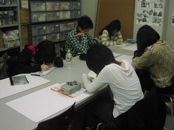16 January AO対策講座・マンガ特講、始まりました。 こんばんは。実技講師の上杉です。先週1月14日(土)、15日(日)に13年度入試に向けた、AO入試対策講座、マンガ特講のそれぞれ第1回目が行われました。↓写真は、15日(日)、マンガ特講の制作風景。第1回目の受講者は5名。皆、本当に集中して取り組めていました。課題は、「性格の異なる二人のキャラクターを考える」というもの。キャラクターの秀でている部分だけではなく、劣等感や欠落している感性など、心の暗部を設定していくと、そのキャラクターの心に、美しい明暗が生まれ、立体感が出るんだと思います。そして、異なった形を持つ、二つの心が接触する中で、お互いの凸と凹が絡み合い、歯車のようにストーリーが動き始めるんだと思います。心の形を彫刻していく事が、キャラクターを作るという事ではないかと思いました。日常でも、魅力的だなと感じる人には、必ず長所と短所があります。暗部と明部が美しく引き立て合うのだと思います。劣等感や、人に言えない苦い思い出など、何にも抱えていない人は、おそらく平面的でのっぺりしていて、美しくないと思います。だから、今のままで良いのかなと、ふと思い至りました。上杉 [0回] 2012/01/16 (Mon) 22:47 アスクでのこと Trackback() Comment(2)
