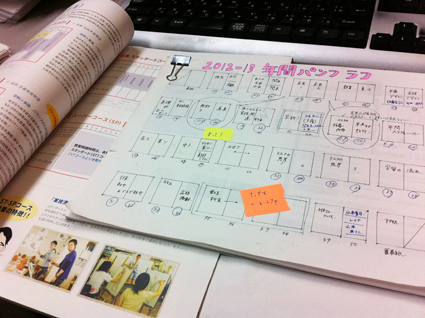 19 January 色彩で思うこと/震災のこと さて、北山教室、今日は色彩構成。 サイトウです。 先日まで、ひーひー言いながら年間パンフレットを作成していました。 色彩構成で指導する「構成力」や「色彩力」は、 あたりまえのようにデザイン作業にも関わってきます。 パンフレットなんかを作っていると、写真・文字・作品写真…など さまざまな要素がからみあいます。 なおかつ「コンセプト」と呼ばれる紙面の意味的な目的も問われる。 要素を画面に放り込んだあとは、 画面全体を目を細めて眺める作業を行います。 (色彩制作でも「画面全体を見渡そう」って言ってるのと同じ作業です) そして、 「なんかまとまりが弱いな」「ここ目立たせたい内容なのに、目立ってない」 「なんかこの色どぎついな」などなど問題点を把握します。 次は、 「まとまりが弱いのは色相を何種類も使い過ぎているからだ」 「目立たせたいところじゃないところの明度差が強くなりすぎているな」 と見当をつけて、改善案を試していきます。 で、改善案の検討が自分じゃつかないとき、他人に相談してみる。 今やってる色彩課題が、仕事につながりそうな気がしてきましたか? 専門家ではない人は、明度や色相や彩度で視界をとらえる意識や訓練ができていません。 「大きさ」や「意味」のみにとらわれがちです。 しんどい思いをして、得られる能力はある分野だと思います。 大学行ったら(私はデザイン科でした)「文字の種類」や「ページ構成」など、 具体的なデザインに関わることをさらに学びます。 もちろん、私なんてまだまだペーペーペーペーパーパーですが…… お母さんお父さん大学へ行かせてくれてありがとう。と最近思う。 でも実際、アスクで働いて学んだことが大きい気もする… みんな、今は自分の能力を創っている時期です。 しんどいこともあるけど、ふんばってコツコツがんばってほしいです。 先日、ウエダさんのが震災のこと、ブログでも書かれていました。 昨日、京芸へ行き、昨年度アスク生の濱口さんが関わる、 震災ドキュメンタリー映画を観てきました。 20歳の岩手県陸前高田市出身の女の子が被災地の現状を記録し、 多くの人に声を届けようと身近な人へインタビューなどをしている内容です。 以前、ニュースにもなったようです。 風化しないようにこうやって、 活動をしてくれている人のアクションにはこたえたいなと思います。 濱口さんや、あちらで遭遇できた京芸生も含めて元気でした!! スマイルなっちゃん <サイトウ> [0回]PR 2012/01/19 (Thu) 17:53 アスクでのこと Trackback() Comment(0)