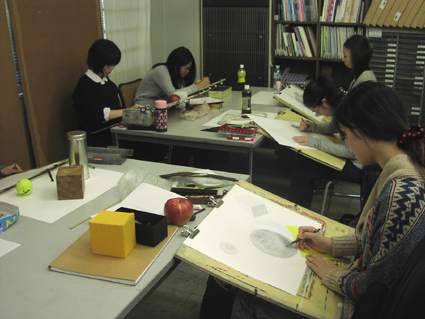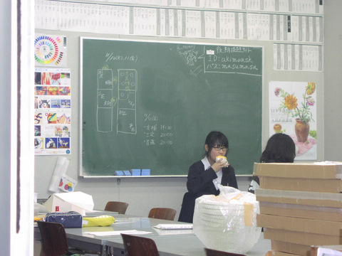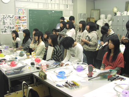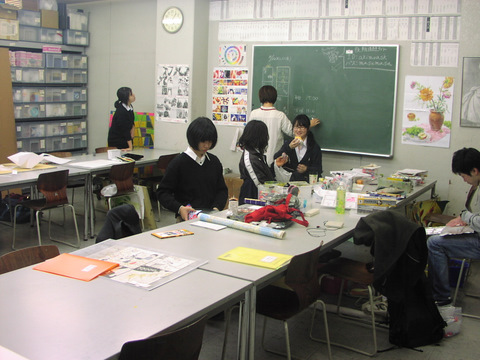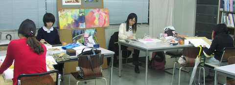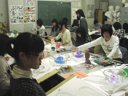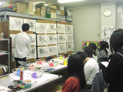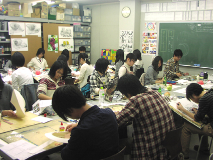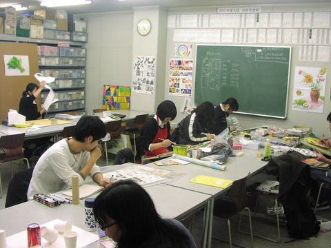 11 November 準備 サカグチです。こんばんは。 平日夜間のクラスは17:30から開始します。 金曜日、ほとんどの受験生は昨日からの続き。 七条教室の時計は17:05。 教室には、17:00から来ていいこととなっていますので、何人かの生徒が、絵具の準備をしたり、ちょっとした食事をしたり。 そして。 まだ時計の針は17:20を回ったところなのに、みんな制作に取りかかりました。 特に催促したわけでもなく、にらみをきかせたわけでもないのに。感心。 「目に入れても痛くない」って、こういうことを言うんでしょうね。 基礎生も、集中して制作しています。 ちなみに、手前に見えているのは、北山にあったはずのNET生の作品。 そう、明日、明後日はいよいよNET生の指定スクーリングの日なのです。 サカグチ [0回] 2011/11/11 (Fri) 21:20 日常の出来事 Trackback() Comment(0)