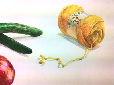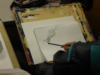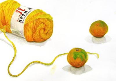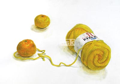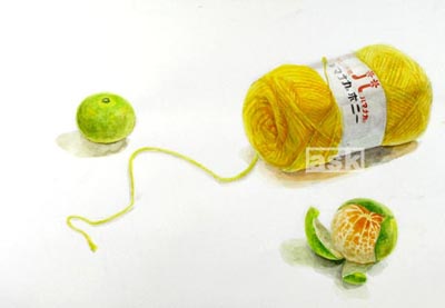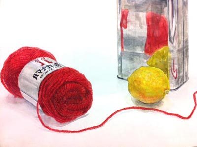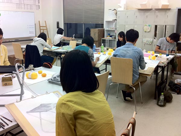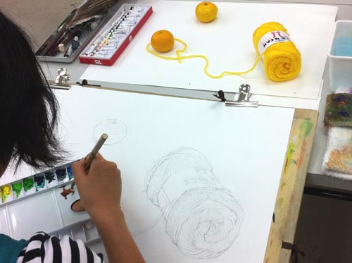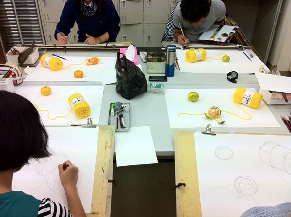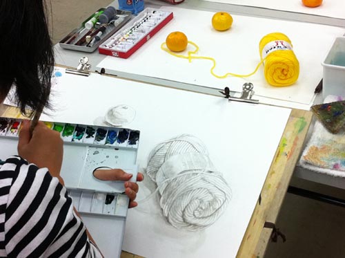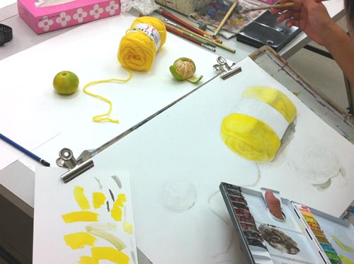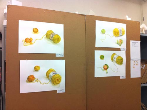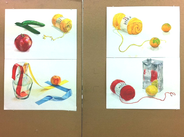 11 October アスクギャラリー掲載作品より アスクHPの中でも常にアクセス数が上位につけている押しも押されぬ人気ページにアスクギャラリーがあります。今回は、現在アスクギャラリーに掲載中の↓の作品の制作風景を紹介します。2点の作品は先週の土曜日、草津教室で制作されました。その日は8名の生徒さんが授業に参加され、描写・着彩・色彩・立体まで様々なを制作しましたが、4名が「毛糸玉、みかん2」を着彩描写しました。※写真左端の男子は同じモチーフを鉛筆デッサンしました。アスクの授業では、高卒生と高3生が同じ課題をする場合、前週に制作された高卒生の作例を参考にしながら制作します。なのですが、この課題は高卒生は制作しない課題なので、過去の類似作例を壁に張り出しました。各教室に分配された優秀作例から選んで張ったのですが、後で気づきましたが、参考に選んだ3枚の作品はいずれも、アスクの非常勤講師(元含む)の受験時代の作例でした。ちょっと紹介します。その前に右上の作品は、これは実は、前日授業(木金夜間授業)で制作されたばかりの高3生Kさんの作品です。Kさんは夏期講習からアスクに来られ、AOで京都造形情報デザインに合格されたのですが、基礎実技力を鍛えることの必要に気づき、合格後もアスクでデッサン、着彩、色彩を学んでいます。夏の時点で初心者から始まって、どんどん上手くなっています。ちなみにこの作品は、着彩2枚めの作品です。それにしちゃ上手いでしょ。この作品には負けるな、という意味でのライバル作例。左上の作例は、ちょうど10年ほど前の高卒生の作例。京芸日本画に進まれ、卒業後は日本画家としてがんばっている人です。東京に居を移され活動されていますが、最近は百貨店などでも個展をされ売れてるとか…。毛糸玉は今回と同じハマナカ ボニーです。色彩豊かに描かれていますね。ややざっくりしてますが。手前に引き出された毛糸の描写が良いですね。毛糸らしいラインに着目してほしい。色彩感、全体感も参考になります。左下の作例は、みかんの作例。これも約10年前かな。京芸デザイン科に進まれ、現在はアシックスでデザイナーをされているようです。色彩248点で合格されていますがさすがに上手いですね。(手撮りなので撮影状態が悪いです)右下は、同じ「ハマナカ ボニー」ではあるが、色が赤色の毛糸玉の作例。レモンも少しみかんと近いので参考になるかなと思いました。これは、約5年前の作例で、現在アスクで非常勤講師をしてくれている京芸日本画院生Yさんの作例ですね。敦煌のお土産の饅頭ありがとうございました。毛糸1本1本(←毛糸玉は1本なので、この表現間違ってますよね!)の縄目を全て描いています。材質感の表現がすごい。ここまで緻密に描いてほしいと思いを込めて張り出しました。さて、制作の方は…今回アスクギャラリーに選ばれた2人の制作過程です。やや異なった方法で下地をつくっていますね。モチーフの色や素材により、方法は様々に異なってきますが、様々な方法を試してほしいですね。左のw君、毛糸玉の色彩感を重視しています。手順は良かったのですが追求がやや浅かった。中右のNさんはデッサンがしっかりしてますね。毛糸玉をしっかり立体としてとらえられている。最終やや濁ったので、今後注意して下さい。せっかくいっしょに制作しているのだから、各自の良いところを取り入れあってほしいと思います。そして講評。十分とはいえない出来でしたが、それぞれがんばったと思います。もうちょっと平行に貼ってほしかったけど。この4枚の中から今回2枚がアスクギャラリーに選ばれた、ということです。ちなみに同じモチーフのあと2枚は彦根教室の作例です。りんごとパスタ袋の作例は、七条教室・北山教室の作例です。今回、参考作例と制作風景を紹介させてもらいましたが、アスクギャラリーを見るとき、掲載作品1枚1枚に、このようなドラマが隠されていることを想像して見てもらえれば、より楽しめるのではないでしょうか。また、参考作例を見る時、この作例を描いた人は今頃何をされているのかな?と考えてもらうと、より制作のモチベーションが高まるかもしれません。これからもアスクギャラリーをよろしくお願いします。Y師より [0回] 2011/10/11 (Tue) 21:13 滋賀・草津駅前教室 Trackback() Comment(0)