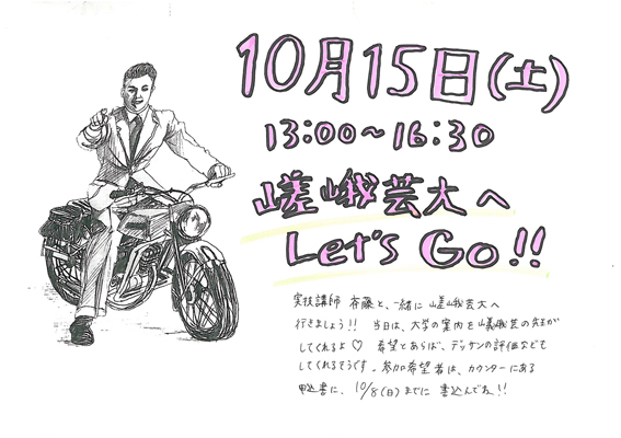 12 October 【参加募集】 10/15(土)嵯峨芸術大学公開講座 今日は、今週土曜日にある京都嵯峨芸術大学の公開講座参加についてお知らせ。 サイトウが興味があって行くので、 せっかくなら行きたい人を募って一緒に行こう! という企画です。■10/15(土)13:00~16:30 (※集合は11:00にしたい)■京都嵯峨芸術大学 有響館G401■「大学における芸術教育」についてのシンポジウム(討論会)※意見を言いたい人は質疑応答で言ったらいいし、聴講だけでもかまわないものです。 前回の「デザインを教える」も聴講してきました。 以前ブログでも報告させてもらいました。 過去のブログはコチラ 今回は、いろんな大学の教授の方々が来られるようです! 大学入る前から、社会について考えるいい機会。 今分かんなくても、いろんな経験をして刺激をうけておくこと自体に価値があると思います。 あとで必ず繋がってくるから。 当日は、嵯峨芸大の石場さんという入試課スタッフの方が、大学校内を案内してくれます。 京都嵯峨芸大を志望している人でなくても、 大学のアトリエの雰囲気を見るのは大学へのイメージが湧いていいもんだと思いますよ。 当日のスケジュールはこんなかんじで考えています。■11:00 京福電鉄嵐山線 車折神社駅集合■11:00~12:00 大学内案内 with石場さん■12:00~13:00前 学食でランチ!自腹でお願いします…きっと安いよ■13:00~16:30 シンポジウム参加 解散 今のところ浪人生や高校3年生などなど、5名参加予定。 忙しい時期だと思います。無理のない範囲で参加を検討してください! 一応前日に参加者には集合場所などの最終確認のメールを送ろうと考えていますので、 参加する人は北山本部まで電話をください。フリーダイヤル01208-01209 (ちなみにOB生、保護者の方もご参加いただけます!) 先日は、京都大学の公開講座に忍び込んできました。 「宇宙と物質の謎に迫る」という物理学の講座です。 2割くらいしか分からなかったけど…、 自分の知らない世界の認識の仕方があるんだなぁ…という敬意の念が湧いてきて わくわくするので、他分野のお話大好きです。 とりあえず、タイムマシーンはいまのところ現実的ではないとのことです笑 明日にはすべての常識がどうなっているか分からないけど…とおっしゃっていましたが。 私は仕事でいけないですが、 京都造形大大学院プロダクトデザインでも公開講座があるようです。 http://www.kyoto-art.ac.jp/graduate/information/111011-002565.html 成安造形大学も。 http://www.seian.ac.jp/lecture/lec_art/ <サイトウ> [0回]PR 2011/10/12 (Wed) 13:14 大学のこと Trackback() Comment(0)