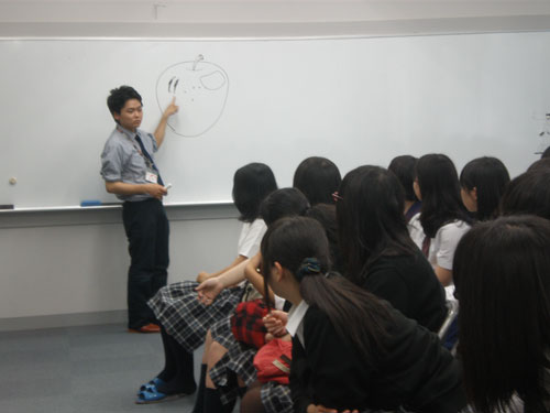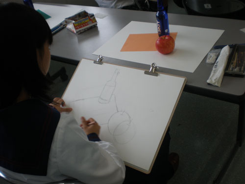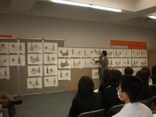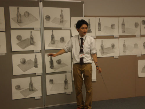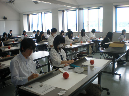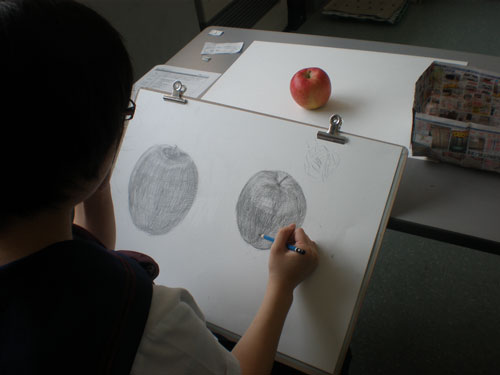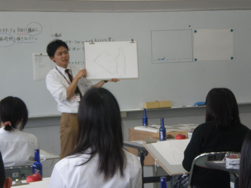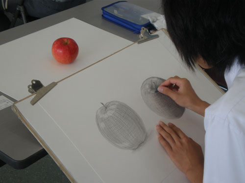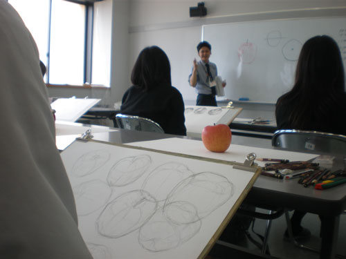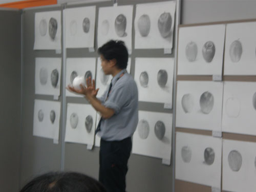 16 June 米子デッサン講習会参加!レポート 先週の土日(6月11、12日)、恒例の「米子デッサン講習会」に行ってきました。簡単にレポートします。米子デッサン講習会は、約10年前から、毎年鳥取県の米子高校で実施されており、毎年アスクの講師が呼んでいただいています。今年は、坂口・保田コンビで行きました。前日の夜中に出発し、早朝着~そのまま授業という強行スケジュール。徹夜で米子へ。しかし、何故か運転はすべて坂口先生。金曜の夕方、立体の講評したばかりなのに。保田はそんなに偉いのか?いいえ、保田運転の車には絶対乗りたくない坂口先生の究極の選択の結果でした…。ともかく授業は開始された。あいさつをするわたくし保田と窓際に米子高校清水先生。坂口先生が授業の導入。初日はりんごを描きました。最初はりんごを見ずに想像で描き、その後りんごが与えられ画用紙の裏面に様々な角度からクロッキー。最後にしっかりと観察してりんごを描きます。左が想像のりんご。右がしっかり観察して描いたりんご。やっぱり違いますね。観察の大切さを実感する瞬間。講評風景。米子高校生がつくった石のりんごも参考に。講ホワイトボードを用いた解説もありました。合格再現作品の展示も行いました。外はのどかな田園風景。2日目は3点モチーフ。ただし、そのうちの1点はりんご。昨日学んだことが活かせるか?はじめ自由に描いた構図を簡単に講評。再度しっかり描く。最後の講評では、保田が松・竹・梅の3段階評価を行いました。ちょっと厳しい評価だったかもしれませんが「梅」だった人もくじけずがんばって下さい。これからが勝負ですからね。この夏のがんばりに期待しています。お疲れ様でした。そして白川先生・清水先生・佐川先生ありがとうございました。Y師こと保田より … 「夏がんばらなくていつがんばる!」 [0回] 2011/06/16 (Thu) 23:45 非日常な出来事 Trackback() Comment(0)