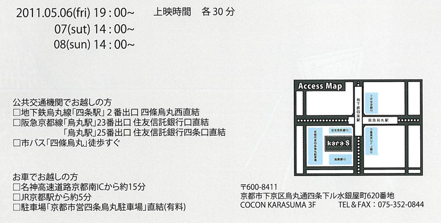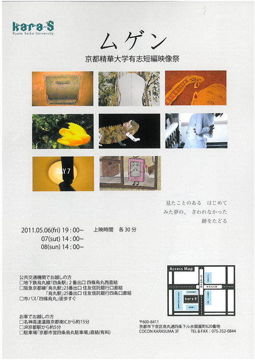 21 April 「ムゲン」 今日は、映像作品の上映会をご紹介します。09卒業生の秋山優さんが作品の上映会をするそうです。秋山さんは、京都精華大学映像コースの2回生。今回は、ゼロから企画を立ち上げ、PRまで秋山さんが中心となって作り上げたということで、すごく気持ちがこもっているのが伝わりました。 秋山さんの作品は中段右の実写映像。ダンスのプロモーションビデオです。是非、見に行ってあげて下さい。 吉井 [0回] 2011/04/21 (Thu) 19:18 未選択 Trackback() Comment(1)