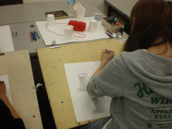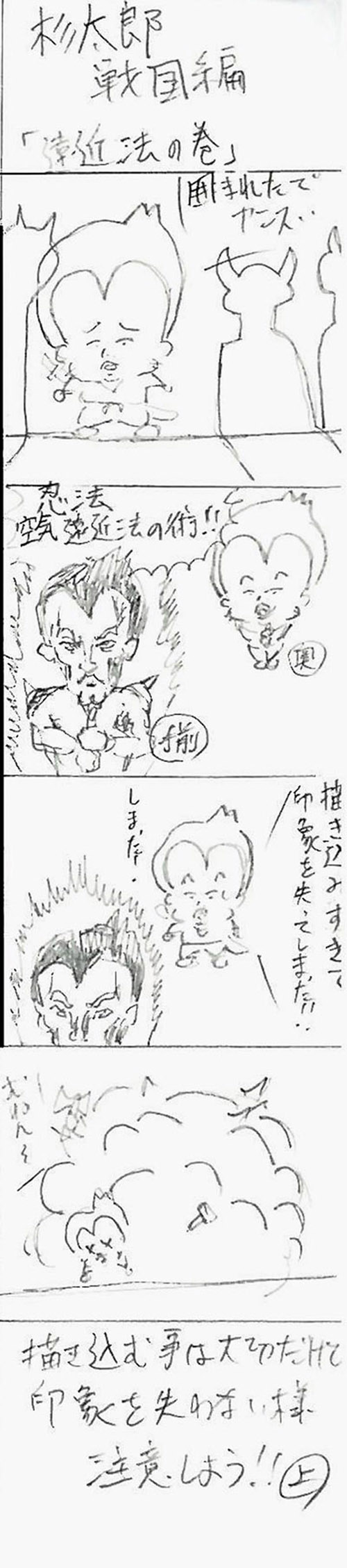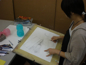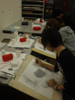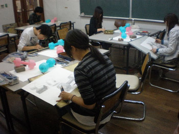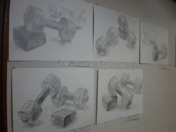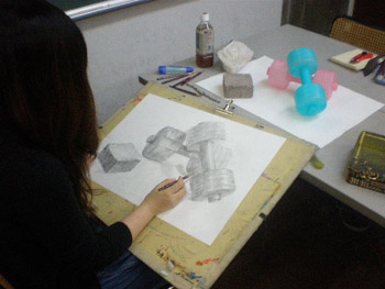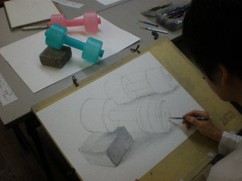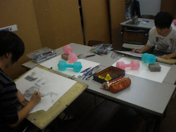 19 October 杉太郎の『今夜も京芸補強』 ♯10 こんばんは!杉太郎の『今夜も京芸補強』の時間がやってまいりました。この番組も、今回でめでたく記念すべき10回目を迎える事が出来ました。温かいコメントをくれている皆様、いつもありがとうございます。コメントに返事を書く事は出来ていませんが、この場を借りて厚くお礼を述べさせていただきます。卒業生の皆もありがとう!全16回でお送りしている杉太郎の『今夜も京芸補強』。コメント7件目指して、今後も頑張り続けます!…そんな事より京芸補強が始まっています!特ダネ探して、制作室に殉職覚悟の突撃取材です。 今夜は、「ダンベル2個、ブロック」の2日目の制作のようです。昨日はほぼ全員の作品が未完成で終わりました。「短い制作時間内でも描ききってやる!」そんな無言のオーラが、生徒皆さんから感じられます。こちらの生徒さんは、昨日からの続き課題。金美の日本画対策を行っています。着彩に入って彩り豊かな画面になってきました。完成するのが本当に楽しみです! こちらはさらに別の教室。京都造形大学の共通鉛筆デッサンの対策を行っています。今日のモチーフは「紙コップ5ヶ、赤毛糸」紙コップ5ヶだけでも大変なモチーフなのに、+赤毛糸なんて…!杉太郎の頭の中で、中島みゆきの「ファイト」が流れてきました。頑張って下さい! 時が経つのは早いものです。京芸補強の講評の時間がやってきました。前回よりも、完成させられている作品が多くありました。ポイントは、「良く観察する事」であったように思います。急ぐからこそ、焦らずに描く一見矛盾しているように聞こえますが、とても大切な事と、杉太郎痛感しています。鉛筆で画用紙を黒くしていく事が描く事ではありません。どんな時でも、「作業」に陥ってしまわないよう注意しましょう。モチーフからどんどん遠ざかってしまいます。良く見て描く。それが、実は最短ルートに繋がっていきます。☆杉太郎の『今夜も学科自習』のコーナー☆今夜も2名の生徒が居残り学科自習。ホウチェンチョイ!(素晴らしい!)広東語です。11月末のセンタープレまであと1ヶ月。頑張って下さい~!最後に、予告していた杉太郎の新作を掲載します。※ブログ掲載に際して、新たに加筆修正を加えています。既に読んだという校内生の皆様も改めてお楽しみいただけます。「杉太郎 戦国編」~遠近法の巻~ふうっ、大河ドラマも顔まけ。大どんでん返しの連続でしたね!それではまた来週~。 <杉太郎制作委員会> [0回] 2010/10/19 (Tue) 22:41 杉太郎関係 Trackback() Comment(4)