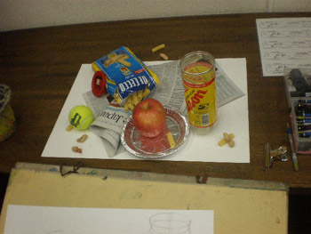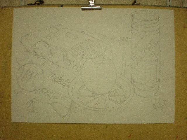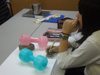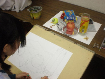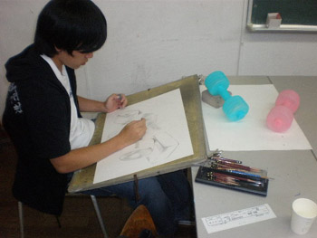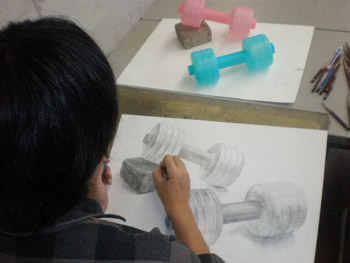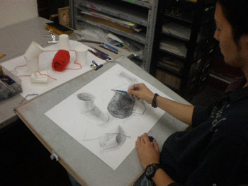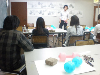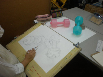 18 October 杉太郎の『今夜も京芸補強』 ♯9 こんばんは!!杉太郎の『今夜も京芸補強』の時間がやっていました!今日はヘリコプターをチャーターし、アスクの上空3000メートルから中継しています!いやぁ、夜の京都は本当に夜景が綺麗です。パウルス北山館があんなにも小さく見えます。機長さん、このまま神戸の方まで飛んでいって下さい。何か美味しいものでも食べようじゃありませんか。……そんな事よりも京芸補強が始まっています!このまま京芸補強中の教室にスカイダイビングです!とうっ!うわあああああーーー!(スタッ)ふうっ。無事京芸補強中の教室に着陸成功しました。どれどれ今回のモチーフは…… ダンベル2個!円柱としての構造を押さえ、直径の異なる様々な楕円形を描いていきます。うーん、大変へヴィなモチーフです。「傾いた円柱の構造を捉える事」、また「綺麗に楕円形を描く事」は簡単に見えて、とても骨の折れる困難な作業ですものね。苦手としている生徒さんも多いと思いますが、この課題を期に、苦手意識を克服できるよう、頑張って下さい!!おやっ、こちらは国公立二次対策講座を受講している生徒さんですね。金沢美術工芸大学、日本画専攻の「着彩写生」の対策を行っています。 リンゴ、ペンネ、英字新聞、テニスボール…、落花生まであります!彩り豊かなモチーフ達がぎっしり!今日の授業で下描きを完成させました。賑やかにモチーフを配置しながらも、まとまりのある良い構図だと思います。描き応え十分のモチーフです。明日は満を持しての着彩。骨の髄までしゃぶりつくして下さい!京芸補強の講評時間になりました。今回の課題テーマであった「円柱の構造」、「楕円形の精度」に関しては全体的に良く取り組めていたと感じます。ただ、全体的にプロポーションが狂っている作品が多く、固有色や質感の描き分けにも物足りなさを感じました。明日のリベンジに期待しています…!最後に、杉太郎の『今夜も学科自習』のコーナー。今日は3名の生徒さんが勉強に勤しんでいます。ギザ素晴ラシス!毎日自習室を利用している生徒さん達は、すっかり一日の流れの中に夜の学科自習が定着している様子です。本当に良いリズムが作れていると感じます。後期もあと5週間。焦る事はありません。一日にできる事は限られています。毎日少しづつ、着実に積み重ねていきましょう。明日はオマケとして、久々に「杉太郎」の4コマを掲載する予定です。今連載されているのは「杉太郎 戦国編」。ドジな忍者に扮した杉太郎が繰り広げる壮大な歴史絵巻です。お楽しみに! <杉太郎製作委員会> [0回] 2010/10/18 (Mon) 22:36 杉太郎関係 Trackback() Comment(0)