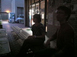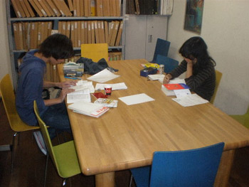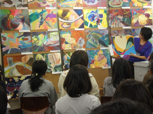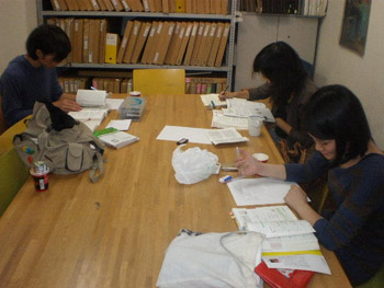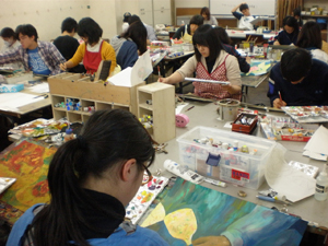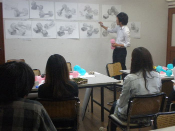21 October 「現役合格者の4年後...」第二弾 第一弾の続き... 作品に近づいて見ると...。まさか...。 このマットな質感には確か見覚えがある...。 「もしかして下に貼ってあるのって、マンガですか?」 「そうです。少年ジャンプです。」 え、あの10年度入試(着彩描写)に出題され、ネットでも騒がれたあの少年ジャンプ...? まさか、O君の作品が入試に影響を与えたのでは...。 そんな訳ないですね...。スイマセン、しょうもないオチでした。 「数年前から、ジャンプを作品に使ってます。マンガで使われている線や形、色、質感などに興味があって。単に下地として貼っているということではなく、その線や形を延長したり、くり返したり、上に描いているのは、マンガの形から出てきているものなんです。」 なるほど...。 その後、しばらく作品論、絵画論に花が咲いたのですが、作品評価などは、ここでは割愛させてもらいます。こっちも、油絵の先輩としては、いろいろケチつけたいこともありましたが、まあ、個人的意見に過ぎないので。とりあえず、この調子でがんばっていってほしいと思います。 さて、17時になり、開館時間になったので、いよいよ本題の「現役合格」についてのインタヴューを始めましょう。彼の部屋のフレスコ教室は別の人が制作中とのことなので、じゃまにならないよう、丸池前ぐらいがいいかな。 あれれ、丸池の前に柵ができてるじゃないですか。えーこれじゃ、丸池に飛び込めへんやんか...。 イヤむしろ飛び込まないよう柵がつくられたんでしょうね。というか、最近の芸大生は、そんなバカなマネはしないのかもしれませんが...。 ここで、もう一人、4年後の現役合格者が来てくれました。日本画院1回生のLさんです。 Lさんは、別にイニシャルがLではないのですが、京芸ファイルの方で、06年度合格者Lさんとして紹介しているので統一します。 http://www.artschool.co.jp/top/kyogei_file/picsf079/1.html (同じアスク出身日本画院1回でイニシャルLさんという人がいますが、そちらではないです、念のため) では、二人にいろいろ聞いていきます。なつかしい受験時代の話題になごむ2人___えーっと、まずO君は現役で合格してどうだった?「まわりの人は、みんな上手くて、それに、僕はとにかく知識もなかったので、現代にしろ古典にしろ。浪人で入った人と比べると何も知らない状態で入ったので、最初はかなりおびえていましたね。逆に聞き役に徹して良かったという面はあるかもしれませんが。」 ___フレスコ(壁画)に行くのは最初から決めてたの? 「いや、それどころか、油画に行ったのも、大学入ってから決めました。とりあえず、美術というのは高校から決めてたけど、日本画は制約が多そうで、油画は自由度が高いから。油画の方がいいかと。」 ___入学後に専攻を決めるというのは京芸らしいね。(他大学だと入試自体が異なる)それで、フレスコはいつ決めたの?。 「油画基礎(1年の前半、入学者全員いっっしょの総合基礎を経て、1年後半と2年前半の2期間は、各科の基礎に配属)の時、フレスコを体験してオモシロイなと思ったのと、壁画だと壁に囲まれた空間全体が作品になるっていう点に惹かれ、フレスコに決めました。先生は自由にやらせてくれるし、興味があることや考えているアイデアについて話をすると、いろいろアドバイスをくれたり協力的でもあって助かっています。」 ___卒業後は? 「こないだ教育実習(中学)に行って、すごく良かったので、先生になろうかと考えています。自分に合ってるかなと。もちろん制作も続けていきますけど。作家ですか?もちろん、絵だけでやっていければ、それはいいだろうケド...。」 ___堅実なんですね。最近は在学中からデビューする人も多いし。そういうのは目指さないのかな。 「ああ、Yさんもこないだコダマギャラリーから声がかかって、個展をされましたね。でもまあ、僕は気長にがんばります。外での個展(貸しギャラリーを借りての)もまだ考えてません。今回のロクリッポウ展はさそってもらっての参加です。壁自体をつくるという新しいことが出来てよかったですね。」 (10月に児玉画廊で個展でデビューしたY君は、現在4回生ですが、美大ではない別の大学を中退した後、アスクでの2浪を経て入っているので、1学年上のO君よりもはるかに年上です)⇨児玉画廊の展示風景http://gallery.me.com/kodamagallery#100583___ではLさんに聞きます。受験時代はどうでしたか。2年生のはじめから始めたよね。「そうなんですよ。そして...。」第二弾ここまで 第三弾10月25日(月)アップ予定 Y師 [0回] 2010/10/21 (Thu) 03:43 京芸ファイル欄外ページ Trackback() Comment(1)