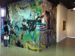 15 October 「現役合格者の4年後...」 このブログは、京芸ファイルの欄外ページとして作成されています。題して 特別インタビュー「現役合格者の4年後...」です。最初に断っておきますが、長くなりそうなので、シリーズものにします。今回は第一弾です。※それと京芸ファイルで紹介した06年度美術科合格Lさんは今回はまだ登場しません。ことの起こりは某Hさんから芸大ギャラリー(新しく出来た御池の方ではなく芸大内の方)でのグループ展「ロクリッポウ展」のお誘いが来たことです。一応匿名にしますが、Hさんは京芸日本画4回生で、アスクで非常勤講師をしてくれている人です。会期は10月11日(月)~17日(日)なので、残念ながらこのブログが掲載される日が最終日だったりするのですが...そのメンバーにO君が含まれていました。O君は現役で京芸美術科に合格し油画に進み、現在は大学院の1回生です。彼はセンターでなんと450/500点(ジャスト9割)の高得点を取り、実技は...の点(非公開:なんとか最低限はとってますね)で現役合格をされました。油画の中のフレスコ(壁画)クラスに所属されハイペースで制作活動、研究活動にいそしんでおられます。実はその年にHさんも現役で受験されたのですが、O君よりHさんの方がはるかに実技力はあったにもかかわらず残念ながら不合格でした。そして1年浪人の後かなりの高得点で合格されました。現在4回生。彼女も学外も含め精力的に活動されています。その年は他にもアスク的にはかなり実技ハイレベルな現役生が何人か落ちてしまい、翌年のアスクスタンダードコースはかつてないほどハイレベルとなったということがあった。そして、その全員が超高得点で受かったのでした。その学年がつくった作例(特に色彩)は今でも重宝していますし、その時のメンバーが今、何人もアスクの非常勤講師になってくれています。(何年かに1度の講師豊作年ですね)そのO君とHさんがいっしょにグループ展をしているという点が興味深く、今回の京芸ファイル「京芸現役合格」の記事になるのではないか、と思い立った訳です。前置きがあまりに長いですね。では、インタビューの前に、ロクリッポウ展での彼の作品を紹介します。やってきました京都芸大芸大ギャラリーは本部棟の真ん中の1Fにあります。ピロティから入ります。入ると最初に展示されていたのは別のアスクOBのFさんのドローイングであった。Fさんはまだ3回生なのだがこれまた精力的に活動している人で、奥にもっとすごい作品があったので、後に紹介します。そして、O君の作品は...とりあえずでかい作品です。さすが壁画クラスというか、支持体の壁自体をつくっちゃっています。3枚の写真は作品をぐるっとまわりながら撮ったものです。わかるかな?で、3枚目の写真の右に立っているのがO君。後で、ファイルを見せてもらうと、これまでも鑑賞者を取り囲むような、壁面を埋めるような作品を多く制作しているらしいことがわかりました。ただし、壁自体をつくったのは、今回が始めたとのこと。しかし、壁に近づくと、驚くような事実を発見したのだった!まさか?...。第一弾ここまで第二弾は、10月20日(水)アップ予定Y師 [0回] 2010/10/15 (Fri) 22:44 京芸ファイル欄外ページ Trackback() Comment(0)