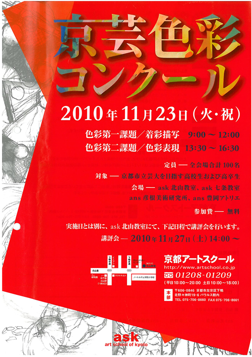 21 October 11月23日は「京芸色彩コンクール」の日 最近昼は暑く、夜は寒いという気温が続いているせいか、風邪をひいている生徒が多くなってきました。うがい・手洗いや、上着を一枚持って出かけるなどの工夫をし、体調管理は万全にしておかないといけませんね。。食生活も関係していることが多いので、ビタミンA・ビタミンC(ニンジン・カボチャ・ほうれん草・ブロッコリー・小松菜・ニラ・チンゲンサイ)を摂取するようにしましょう!さてさて、後期授業が終わった頃に京芸色彩コンクールが行われます。毎年多くの方が参加されるので、たくさんの作品が見れるとてもいい機会です。また、自分の今の実力を確かめれる場でもあります。(↓昨年度の様子)そして、講評会も行います!例年多くの色彩高得点者を出している京都アートスクールの考え方についてわかりやすく解説致します。上位5名の生徒には絵の具セット等の商品もありますよ・・!!(↓昨年度の様子)緊張感たっぷりな雰囲気ですが、同じ大学を目指している仲間たちと制作し、たくさんの作品を見ることによって良い刺激がもらえるのではないでしょうか。みなさんのご参加お待ちしています。詳しくはこちらをご覧ください。→http://www.artschool.co.jp/top/c10kyo_con/index.html<ウエダ> [0回]PR 2010/10/21 (Thu) 17:11 アスクイベント Trackback() Comment(0)