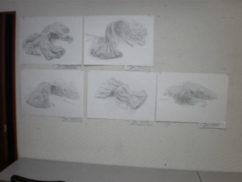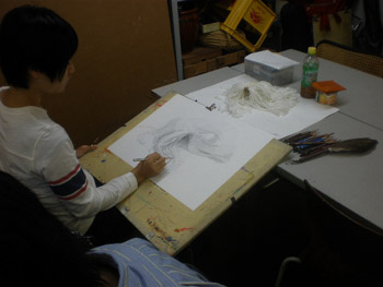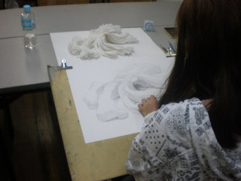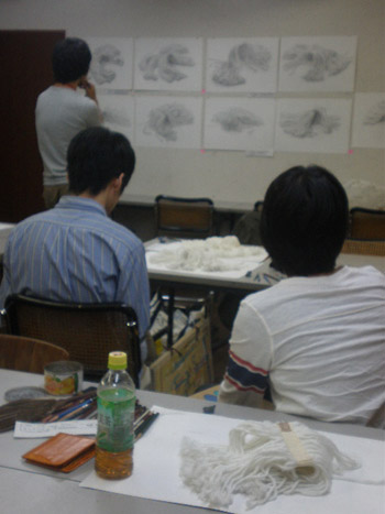 05 October 杉太郎の『今夜も京芸補強』 ♯6 こんばんは!杉太郎の『今夜も京芸補強』、今回で第6回目。熱心なリスナーに支えられて、ここまで来る事が出来ました。これからも、コメント7件目指して頑張り続けます!今日の京芸補強は2日目。描写「モップ」の2枚目の制作に取り組んでいます。 昨日の講評の中で上がった問題点は、「構図」「制作プロセス」、「明暗の階調を増やす」、「前後の空間性」などでした。「モップ」という一つのモチーフを描くのに、本当に沢山の注意点があるのですね!!高校の時に掃除道具として何となく使用していた時は、まさかこんなに複雑な存在だったとは思いもよりませんでした。しかし、普段身近にあるなんて事ない物でも、描くとなったら、全く別の存在に感じる…。それも鉛筆デッサンの一つの面白さですよね。この世にある全てのものがモチーフになり得る。そんな見方で、身の回りのものを観察すると、とても新鮮な世界に感じるのではないでしょうか。そんな事をふと感じました。いやはや、杉太郎、鉛筆デッサンなるものにどっぷりハマッてしまいそうです。 講評風景です。京芸補強では毎回、1枚目の問題点を意識しすぎて、2枚目の方が少しクオリティが下がってしまう作品が何枚か出てきますが、今日の作品は、全ての作品が1枚目よりも良い出来栄えでした。ポイントは、『構図』であったと思います。今日の制作では、モップの持つ「質感」や「空間」が表現しやすいような構図が皆、組めていたと感じます。構図の段階で、表現しやすい置き方や表情をつけてやるのは、これから描く自分に対しての「思いやり」だと思います。「描く前に勝負はついている。」そんな言葉を受験生時代に耳にした事があります。うーん、構図、侮りがたし…。デッサン奥深し…。さてさて、皆さんお待ちかね、杉太郎の『本日の自習風景』のコーナーです。エクセレント!!絵に描いたような勉強風景。平日の夜間17:30~20:00、毎日自習してから帰路につく。とても有意義な時間の使い方だと思います。杉太郎が受験生ならば、この自習室、必ず使用していた事でしょう…。この調子で頑張って下さい!それではまた来週。 <杉太郎製作委員会> [0回] 2010/10/05 (Tue) 22:10 杉太郎関係 Trackback() Comment(3)