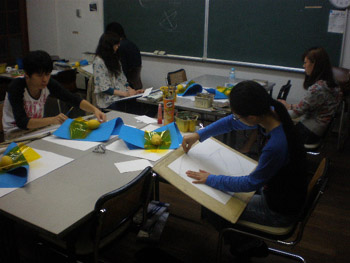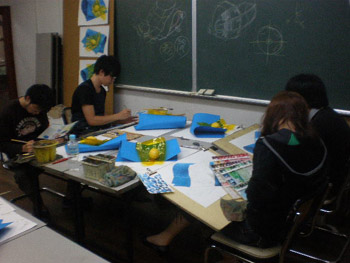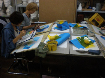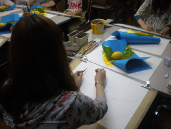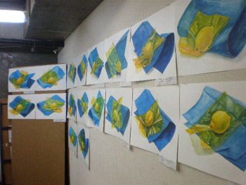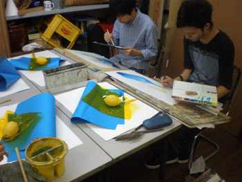 12 October 杉太郎の『今夜も京芸補強』 ♯8 こんばんは!良い子の皆さん、お待たせしました!杉太郎の『今夜も京芸補強』の時間です。「1週間が待ち遠しい」、「毎日更新して欲しい」、「杉太郎のグッズを発売して欲しい」等等、アスクでは今、空前の杉太郎ムーヴメントが巻き起こっています。そんな夢を見ました。そんな事より、京芸補強が始まっています!!制作室に突入です。うーん、今日はやけに教室前の警備が固いですね。おやっ、教室の外で着彩道具を準備している生徒を発見。よし、液体化して生徒の筆洗の中に紛れ込むぞ!ドロドロドロ…。ふうっ、何とか潜入に成功しました。どれどれ… ↑今日は昨日に引き続き、「青色紙、黄色セロファン、檸檬」の2作目の制作に取り組んでいます。構図を改良している生徒、新しい制作プロセスを試みている生徒、水の分量、筆使いに注意を払っている生徒…。昨日のリベンジを果たす為、色々な工夫を凝らし、問題点克服に取り組んでいます。ご武運をを祈ります……! ↑いよいよ講評タイム。ズラリ!と完成作品が並んでいます。上下2列に並べられた作品の内、上の列に貼らている作品は1枚目、下に貼られた作品は2枚目の作品です。本当に難しい課題でした…。昨日の問題点を全て克服できた作品は、残念ながらありませんでしたが、一人一人の作品に、昨日よりも良くなっている部分が確実に見られました。制作時間も短い中、健闘していたと感じます。今回上手く行かなかった生徒さんも、今日の制作の経験が必ず、次回に役立ちます。蛇行運転のように自分の上達スピードが遅く感じる時もあります。ただ、確実に前進している事は忘れないで下さい。「自分が上達する事に、どれだけ自分自身が我慢強く待ってあげられるか」それが上達に一番大切な事だと、杉太郎強く感じます。最後に、杉太郎の『今夜も学科自習』のコーナーです。今夜も黙々と勉強中。ハラショー!!ロシア語で「素晴らしい」の意味です。午後の制作を終えた後も、集中力を持続させるのはとても大変なことです。杉太郎、何か美味しい物でもご馳走してあげたい気分です。頑張って下さい!それではまた来週。 <杉太郎製作委員会> [0回]PR 2010/10/12 (Tue) 22:31 杉太郎関係 Trackback() Comment(5)