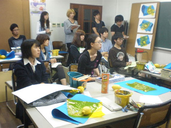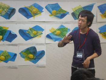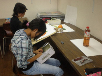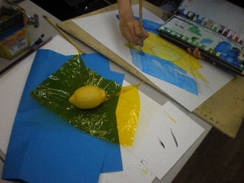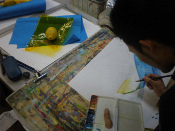 11 October 杉太郎の『今夜も京芸補強』 ♯7 こんばんは!杉太郎の『今夜も京芸補強』の時間がやってまいりました!「身長40cm、体重7キロ」杉太郎のオフィシャルなプロフィールです。国民的人気キャラクター、ピカ○ュウと同じ身長・体重とは、いやはや杉太郎、生まれながらにして、人気者の星の下に生まれきてしまったようです。そんな事より、京芸補強が始まっています。制作室へワープです!(ヴーーーーン)制作室は石膏像の隙間にワープしてきました。おやっ、今週は「着彩」ですね、前回の京芸補強「着彩」ではホウレン草を描いていましたが、今日はどんなモチーフを描いているのでしょうか。どれどれ… 今日のモチーフは「青色紙、黄色セロファン、檸檬」ですね。黄色セロファンが重なった部分の色味の変化を、しっかりと表現できるかが、この課題のポイントのようです。それだけではなく、「セロファンと色紙の質感の描き分け」、「檸檬の凸凹感や量感の表現」、はたまた「画面全体の空間的なまとまりの表現」等…、うーん、後期も既に第7週。後半に入り、京芸補強の課題も一段と実戦的になっています。難しい課題ですが、この課題が克服できたとき、着彩力は今より1ランク上達していると思います! 皆頑張って下さい~! 隣の教室では、推薦対策講座が行われています。あれやこれやで10月もう11日が過ぎました。11月の推薦入試まで約1ヶ月。MASHYUU先生の講評にも熱がこもります。↑夜間の通常授業の風景です。上の二人は中学生の生徒さんです。銅駝高校への受験に向けて、一所懸命制作に取り組んでいます!!青物の着彩は難しいですよね。ファイト~!!最後に杉太郎の『今夜も自習室』のコーナー。今日も三人の生徒が自習室で勉強しています。ファンタズィスティコ!!素晴らしいです。今日は夜の自習室を初めて利用している生徒さんも見受けられます。この調子で頑張って下さいね。それでは今日はこの辺で。また明日。 <杉太郎プロジェクト推進委員会> [0回] 2010/10/11 (Mon) 22:13 杉太郎関係 Trackback() Comment(1)
