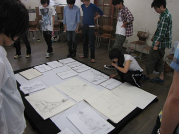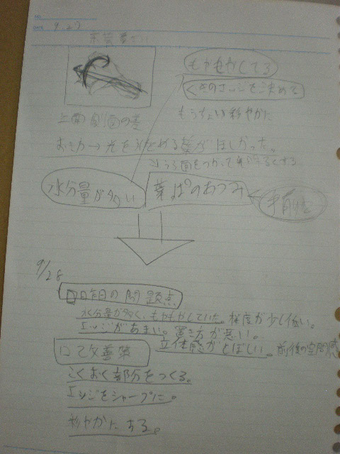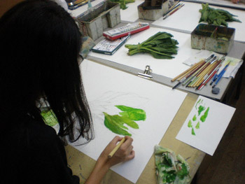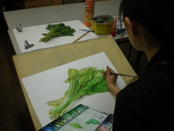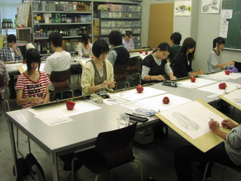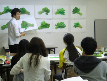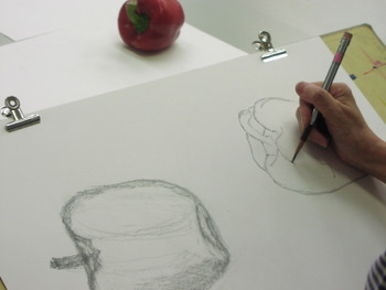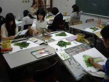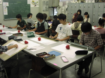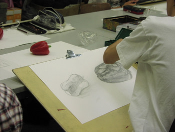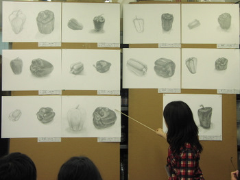 パプリカの形をぼんやりと思いだすことはできても、描いてみると、どのような形をしていたのか、どのような色をしていたのかわからない部分が出てきます。間違ってもかまわないので、決定して描くことが大切です。実際のモチーフを見たときに、間違っていないことが目標ではなく、間違えたあとで、本当の形、本当の色を発見することが今回の課題のねらいです。
