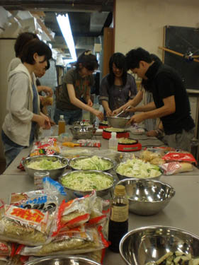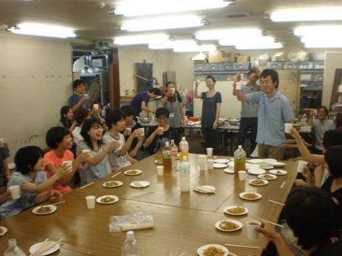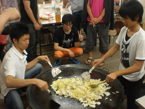 05 August 恒例!持ち寄りやきそば大会!! 先日、北山教室にて毎年恒例『持ち寄りやきそば大会』をしました♪持ち寄りなので、各々好きな材料を持ってきて調理しました。授業が終わったあと、皆で準備をしました。女性陣は野菜切りを、男性陣はやきそばのセッティングをしていました。S先生は、生徒が持ってきたいんげん豆を見てテンションが上がり気味です。準備が始まりました。アスク特注の巨大鉄板でやきそばを作って、何が入っているか食べてみてからじゃないと分からないたこ焼を作って、ミニライブに向けて歌の練習をして・・・。七条教室の生徒が集まってから、いざ『乾杯!!』大教室が人でいっぱいです。。夏の暑さには負けませんが、たこ焼きの熱さには勝てません。。なかなか皆で集まってご飯を作って食べる機会が少ないので、貴重な一日となりました。また、夏期講習の第5期間目ともあり、いい息抜きができたのではないかと思います。残りわずかな夏期講習、皆と共に頑張っていきましょう!<ウエダ> [0回] 2010/08/05 (Thu) 19:46 アスクイベント Trackback() Comment(0)