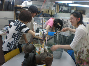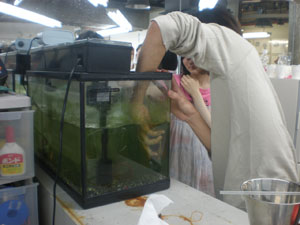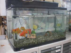 06 June 水槽のお掃除 土曜日は、オープンアトリエとして教室を開放しています。授業時間内で完成できなかった作品を仕上げたり、自身で課題のテーマを決めて制作します。この日は、コラージュ制作をするST.SP生が来ていました。モチーフに使用していた金魚を元の水槽に帰そうと生徒が運んでいた所、あまりにも元々の水槽が汚かったので掃除をしてくれました。水槽にはタニシが居ますが、掃除が間に合っていない様・・。亀の臭いがするーー!!といいながらも、ゴシゴシ洗っています。おかげ様で水槽がとっても綺麗になりました!どうもありがとう!<ウエダ> [0回] 2010/06/06 (Sun) 11:32 アスクでのこと Trackback() Comment(2)