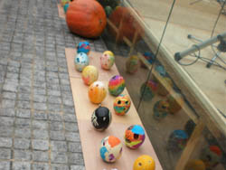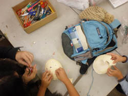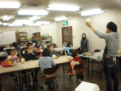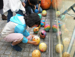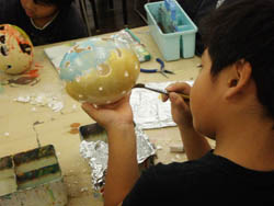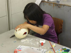 01 November だちょうのたまご 報告が遅くなってしまいましたが、 10月24日のこども造形表現教室では、 特別授業 ★ハロウィン☆ランプシェード★を作ろう ということで、 ランプシェードを作りました。 去年は、北山ハロウィンのイベントとして開催されたカボチャのカービングに参加し、カボチャのランタンを作り、飾らせて頂きましたが、今年は、教室で作ったものを飾らせて頂けるということで、京都アートスクールの北山教室にて制作。 そして、なんとっ!?こどもたちの作ったランプシェードの材料は、 だちょうのたまごっ!!? だちょうの卵を高らかに掲げるこども教室の先生。 あまりにも硬いので、事前にドリルで穴を開けておきました。 その穴の周りをペンチで少しずつ割って、模様を作っていきます。 勢い余って割りすぎたたまごは、ボンドで補修…。 模様をつくり終わると、周りと中に色を塗ります。 中まで塗ることで、光を灯した時にとても綺麗です。 完成したランプシェードは、「陶版名画の庭」の前に設置されたステージ前に置かせて頂きました。 夜には、小さなキャンドルを入れて、ライトアップ。 とても綺麗に光が灯っています。 普段手にすることのないであろう希少な材料を使っての制作は、驚きいっぱいで、とても楽しいものになりました。 だちょうのたまごを提供してくださったり、展示用の場所を用意してくださったりと、北山ハロウィンの関係者の皆様、本当にありがとうございました。 この場を借りてお礼申し上げます。 <S.I> [0回]PR 2009/11/01 (Sun) 20:29 こども造形表現教室 Trackback() Comment(0)