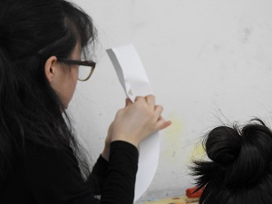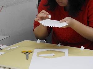 立体「○○○動く」というテーマで、紙を素材として、5時間で制作しました。ザクザク動く、ニュルニュル動く、パキパキ動くなど、ある程度繰り返しの形を表すことで、動きを演出します。一つの形では十分に動きが感じられなくても、繰り返しによって動きを感じるのでしょうか。 パキよりもパキパキパキ。ツルよりもツルツルツルのほうがイメージが沸いてくるでしょう。