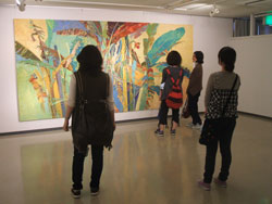 22 May 成安造形大学説明会に参加(5/19) ホテルグランヴィア大阪で開催された成安造形大学説明会に行きってきました。この時期、各大学で入試説明会があり、askでも先生が手分けして参加して入試変更点などの情報を集めます。今どきはNETなどで一通りの情報を得ることができますが、やはり先生方や入試課の人から直接話を伺うことでこそわかる情報もあるのです。で、今回たまたま僕が担当となり参加したという訳です。今回の説明会の目玉は09年度から導入されるAO入試に関することです。今回成安造形大学がAO入試を導入するということは、京都の私立芸大のすべてがAOを導入したことになります。ただし当然ではありますが、同じAOといっても各大学ごとに様々な形があります。成安AOの特徴は、エントリー、体験授業の段階では志望コース別ではないこと、結果が出た後(出願の可となり、出願することを決めた場合)かなり後にクラスを選択できること、などです。話をされた泊先生、岡田先生、入試課長日比野さん左下写真の壇の左端は南先生。大学時代最も仲の良かった友人。説明会が終わると、もう一つの目的である信濃橋画廊に向いました。信濃橋画廊では、偶然なのかわざとなのか成安造形大学洋画クラスの長尾先生の個展のオープニングがあったのです。それもあって大阪での成安の説明会に立候補した訳です実は....。先生は京芸の先輩にあたりますが、出身は版画だし学年もかなり上でなのですが、学生時代、展覧会は必ず行っていて、会場でお話をしてもらう機会も多かったのです。その後、先生は成安造形大学で先生をされるようになり、こちらは予備校講師になったので、10年ほど前からは別の意味でお世話になることになり、逆に、展覧会に行かせてもらう機会は少なくなっていました。個展会場には、児玉先生(京芸1回生時代の先生でした)、先ほどグランヴィアでの説明会でも挨拶をしたばかりの岡田先生も来られました。もちろん本人もおられ、パーティーが始まりました。洋画の学生達もたくさん来ていて、僕がさげていた成安説明の会手提げ袋に反応してた。説明会では聞けない生徒達の生の声、本音がイロイロ聞けました。イヤ裏面がわかったとかじゃなくて、生徒達は成安を愛してましたよ、ホントに。だって生徒達が成安の洋画に生徒を送ってくださいと僕に頼んでたぐらいですから。ここにきて、より成安造形大学についてわかることができたと思います。経費で大阪に行って遊んでたという訳じゃないんです。ビールもかなり飲みましたが....。信濃橋画廊は大阪の老舗画廊で本町にあります。そこへ行くのもひさしぶりだったので地下鉄乗り間違えたりもしましたが。本町で御堂筋と四ツ橋筋の間なので高速道路の乗り口が集まっており、その記憶でなんとかたどり着いたという有様でした。5階にある画廊に行く途中も窓から高速を行き交うトラックが見えます。それを見ると大阪だなと実感しました。長尾先生の作品の一つは映像(動画)を用いたもので、「いや〜、長尾さんは映像もつくるようになったのか」などと驚いて見ていたのですが、実は’99年頃に撮影した映像作品をデジタルで読み込み、再処理して新たに完成させたものだとのこと。なんと10年前には既に映像作品をつくってたのか!と再度驚ろかされてしまった。成安でも激務をこなされながら制作活動も発展させていたということなのですね。仕事が忙しいから絵が描けないってのはやはり言い訳でしかないんだなと思いました。今日は完全な成安デーとなりましたが、いろいろな意味で良い刺激にもなりました。ありがとうございます。 Y師 [0回] 2008/05/22 (Thu) 02:42 大学のこと Trackback() Comment(0)