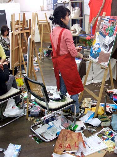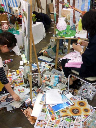 03 May コラージュ 今週後半のスタンダード生の課題は、コラージュ技法を用いた構成静物描写でした。持参した雑誌や新聞紙、画用紙や和紙などに彩色して自作した色紙、などなどを切り貼りすることで画面をつくりますが、自由な画面をつくるのではなく、あくまで教室に構成されたモチーフを描写することが求められるというところに課題のポイントがある。筆と絵具で描くのと違い、描写には困難が伴います。なので、なかなか仕上がらない。が、混沌の中にじわじわと秩序が立ち上がってくる時のスリリングさが経験できたり、「わかりやすすぎる秩序をズラしていく」という、表現一般にとって重要なテクニックが学べたりします。という訳で授業時間内で完成させきることができず、土曜のオープンアトリエに持ち越す生徒続出という結果になりました。毎年のことですが。Y師 [0回] 2008/05/03 (Sat) 19:46 アスクでのこと Trackback() Comment(2)