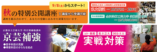 05 September 後期(2学期)途中入学者募集について 事務局の松川です。台風の影響で被害に遭われた方には心中お察し申し上げます。私の住む町でも長い時間停電被害でした。いち早いライフラインの復旧が望まれます。京都アートスクールは予定通り開講いたします。来週からはST・SP生の後期授業も始まります。2019年の前期試験に向けて実技授業も再スタートします。高校3年生のクラスも後期授業が始まっています。平日クラスが明日からです。高校2年生、1年生の通学生も2学期授業が開講中です。中学3年生のクラスは美術系高校の実技試験対策を引き続きおこないます。 現在、後期(2学期)途中入学の受付期間となっております。9月の第2週からでも授業を受講できます。詳細は下記バナーをクリックしてご検討ください。 同時に、NET通信実技コースの後期(2学期)も受講生を募集中です。「冬期講習、直前講習」前にNET通信実技コースと合わせて実技を学んでみませんか。 前期試験まであと173日。 [0回] 2018/09/05 (Wed) 15:00 アスクでのこと Comment(0)