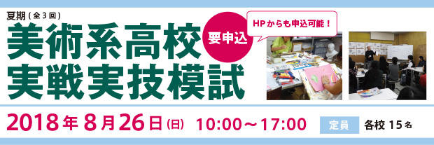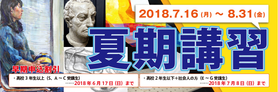 07 June 申込先着順!宿泊+講習セット こんにちは、事務局カネコです。暑い日が多くなってきましたね。室内でも熱中症になりやすいとか。無理せず室内温度調節、こまめに水分補給をするようにしましょう。ι(´A`υ)さて、いよいよ夏本番、夏期講習の時期ですね。今日は講習と宿泊がセットになったお得な「宿泊+講習セット」についてご紹介いたします。自宅が遠方のため、京都アートスクールに通学することが難しい方におススメです。この夏、集中して取り組みたい方はぜひ!現時点でも申込み多数来ております!申込方法は宿泊+講習セット申込用紙、夏期講習申込用紙に必要事項記入後、郵送、FAXにて事務局までお申し込みください。HPから申込書類をダウンロードすることも可能です。この夏に力をつけることで志望校合格にぐっと近づきます。長期休みを存分に活かして実力を伸ばし、今年度後半へ臨みましょう!( ..)φ [0回] 2018/06/07 (Thu) 14:08 アスクでのこと Comment(0)